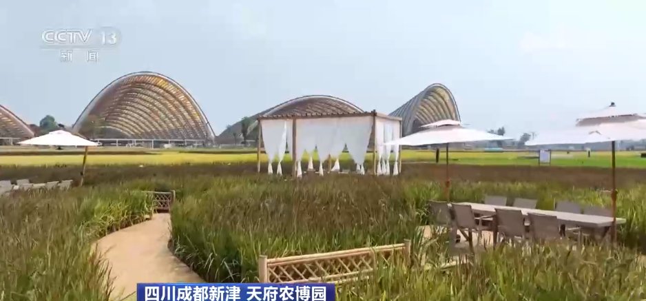 四川成都新津天府农博园里,紫黑、紫红、金黄三种特种稻种和大田水稻一起组成多彩图案和造型,每亩预计产量跃上800斤的新高。稻田边创意涌动,一杯杯稻田咖啡香醇四溢,一朵朵葵花正在向阳绽放,悠然演奏着喜悦丰收的“大地乐章”。