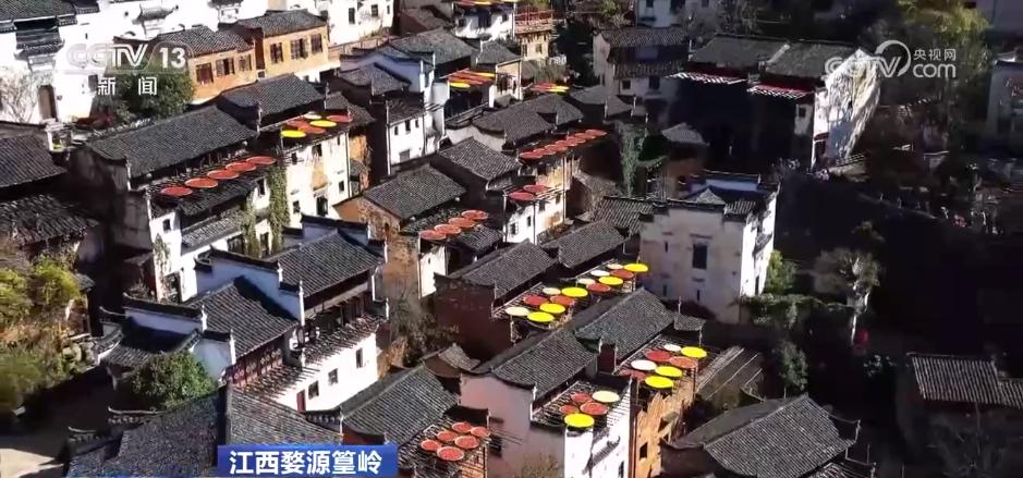 在江西婺源篁岭,多种农产品和徽派建筑对比鲜明,共同构成了婺源独特的“晒秋”景观。优质的生态环境孕育了“红、绿、黑、白、黄”五大特色物产,“晒秋”成为“中国最美乡村”的特有名片。