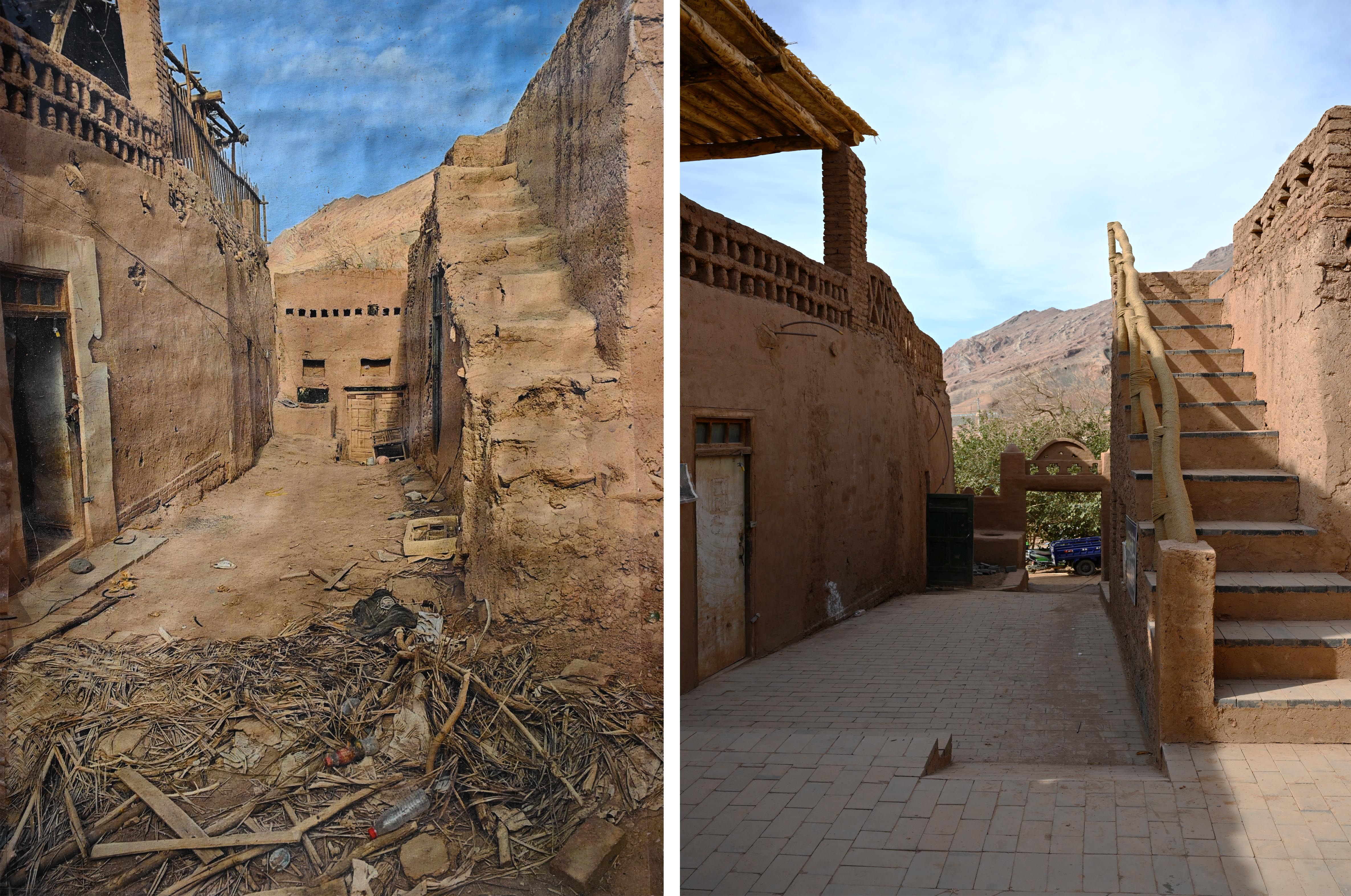 左图为2024年7月2日拍摄的吐峪沟村的一处院落(10月8日翻拍资料照片);右图为2024年10月8日在同一地点拍摄的保护维修后的院落。