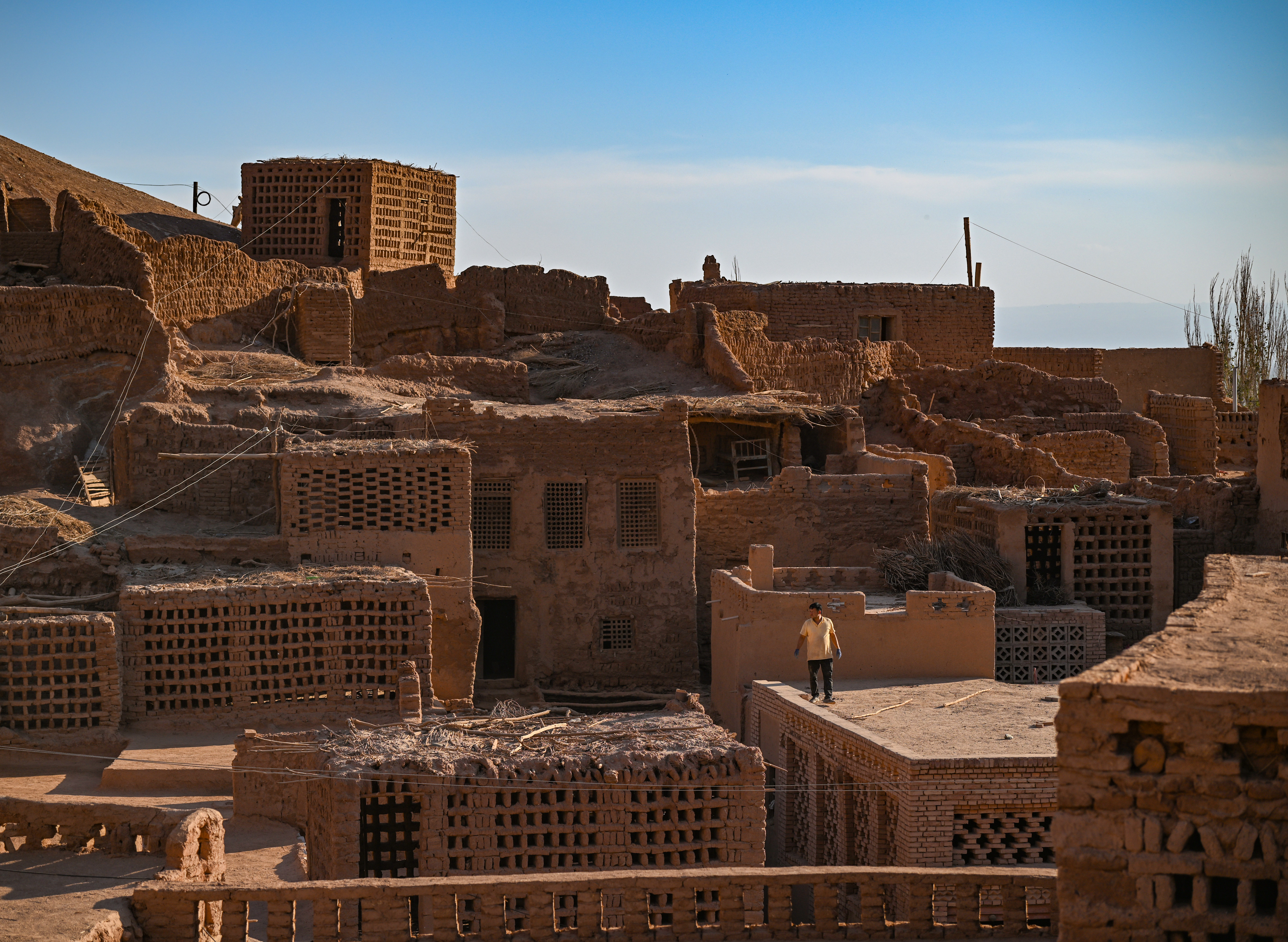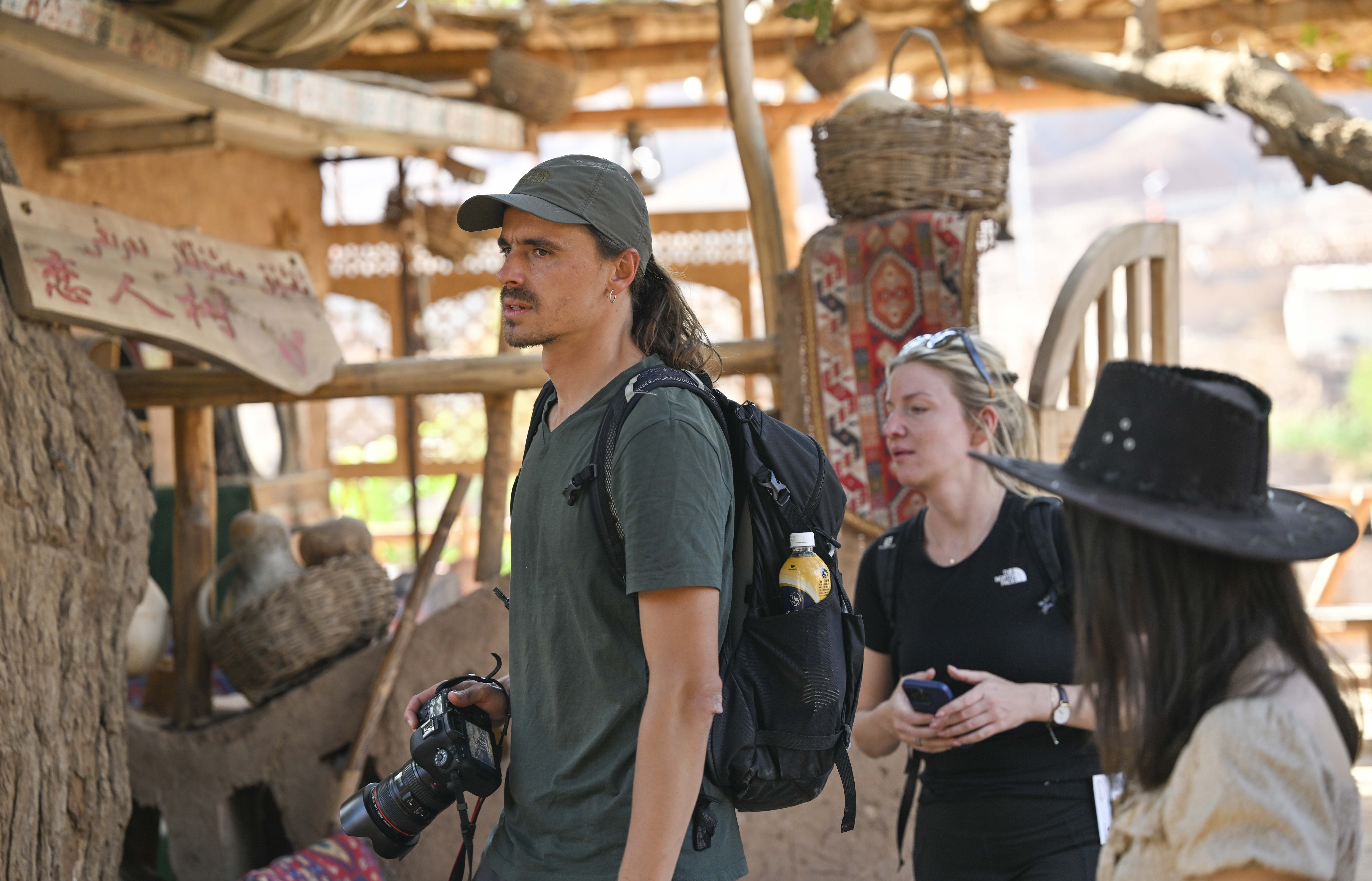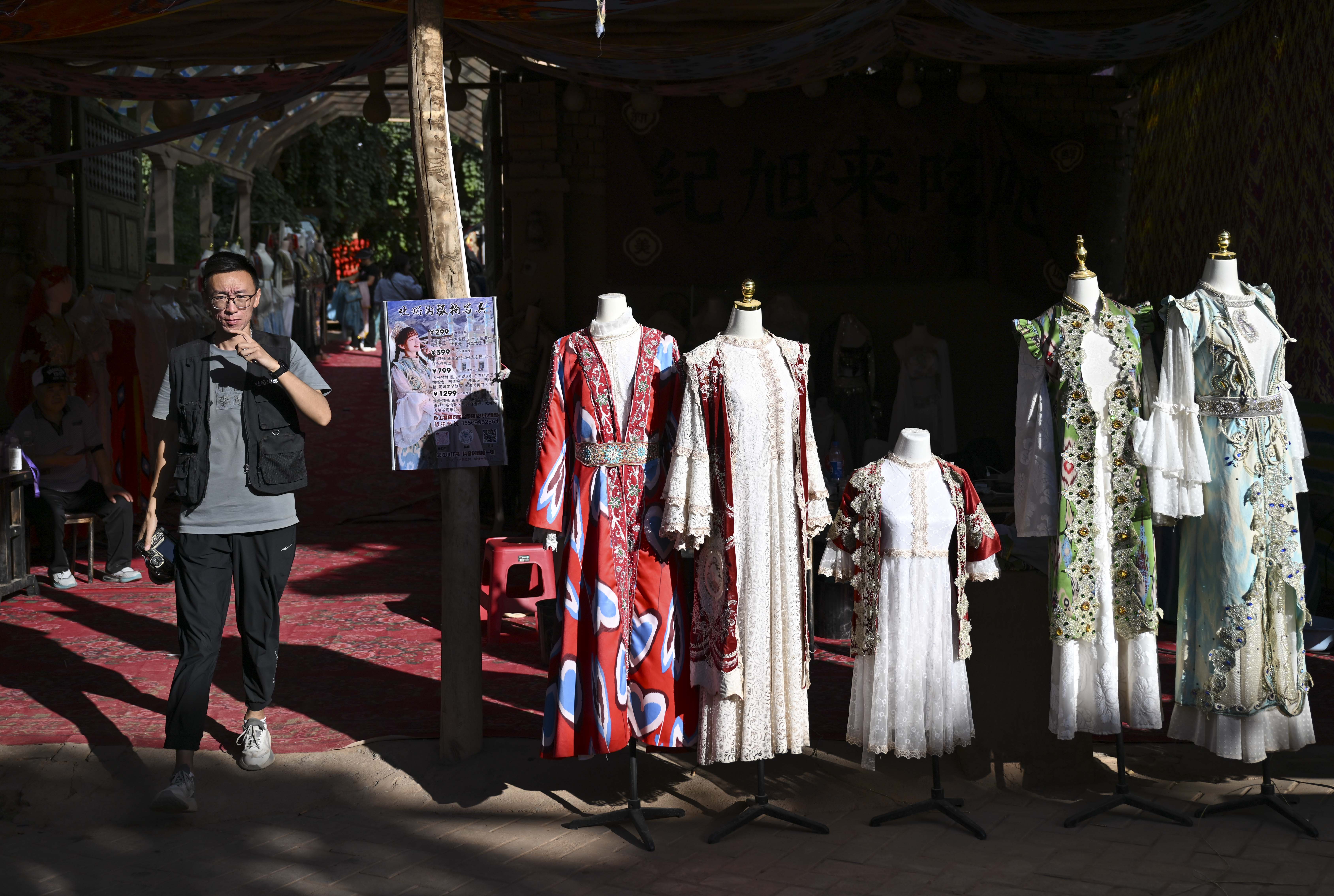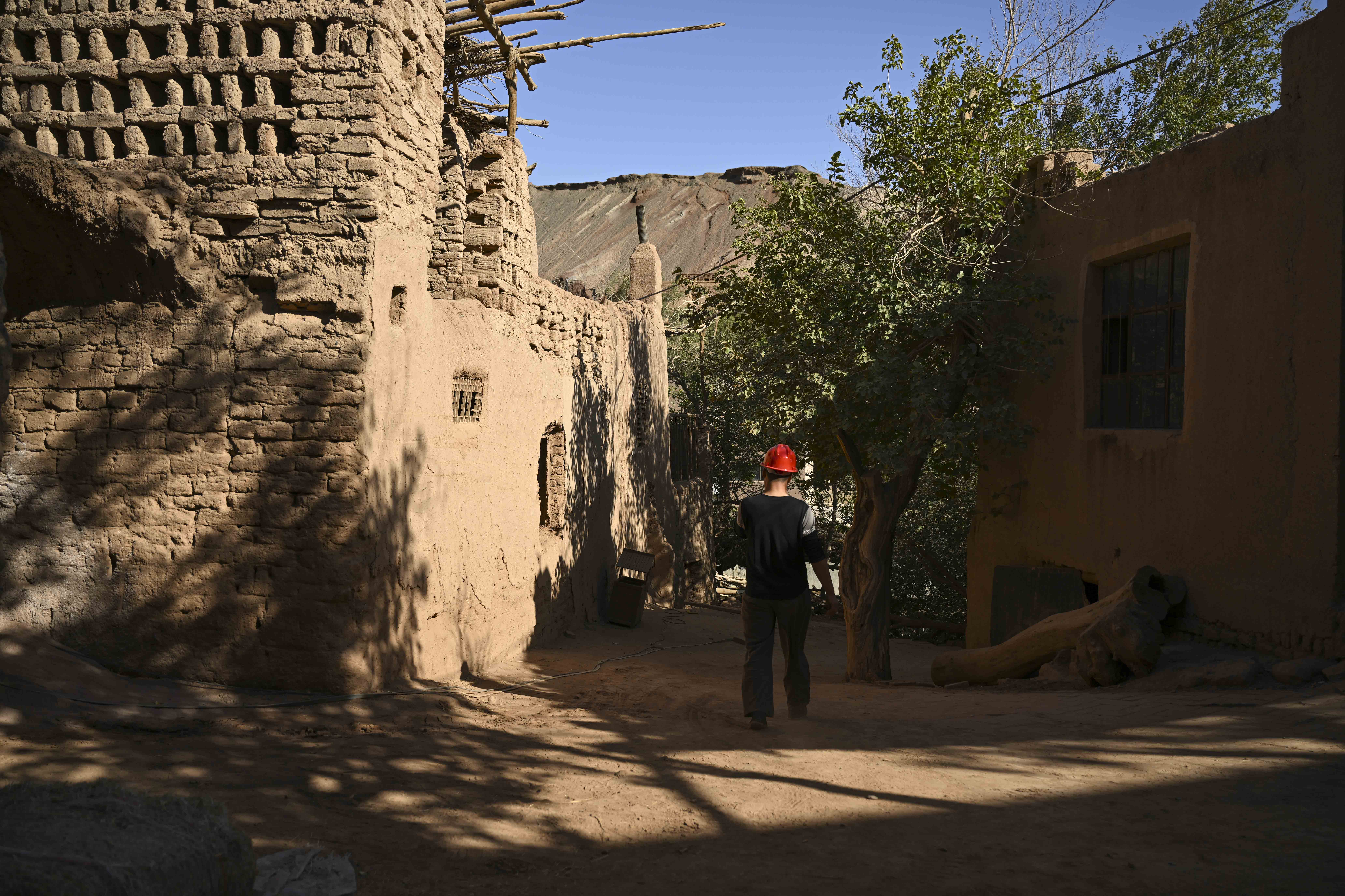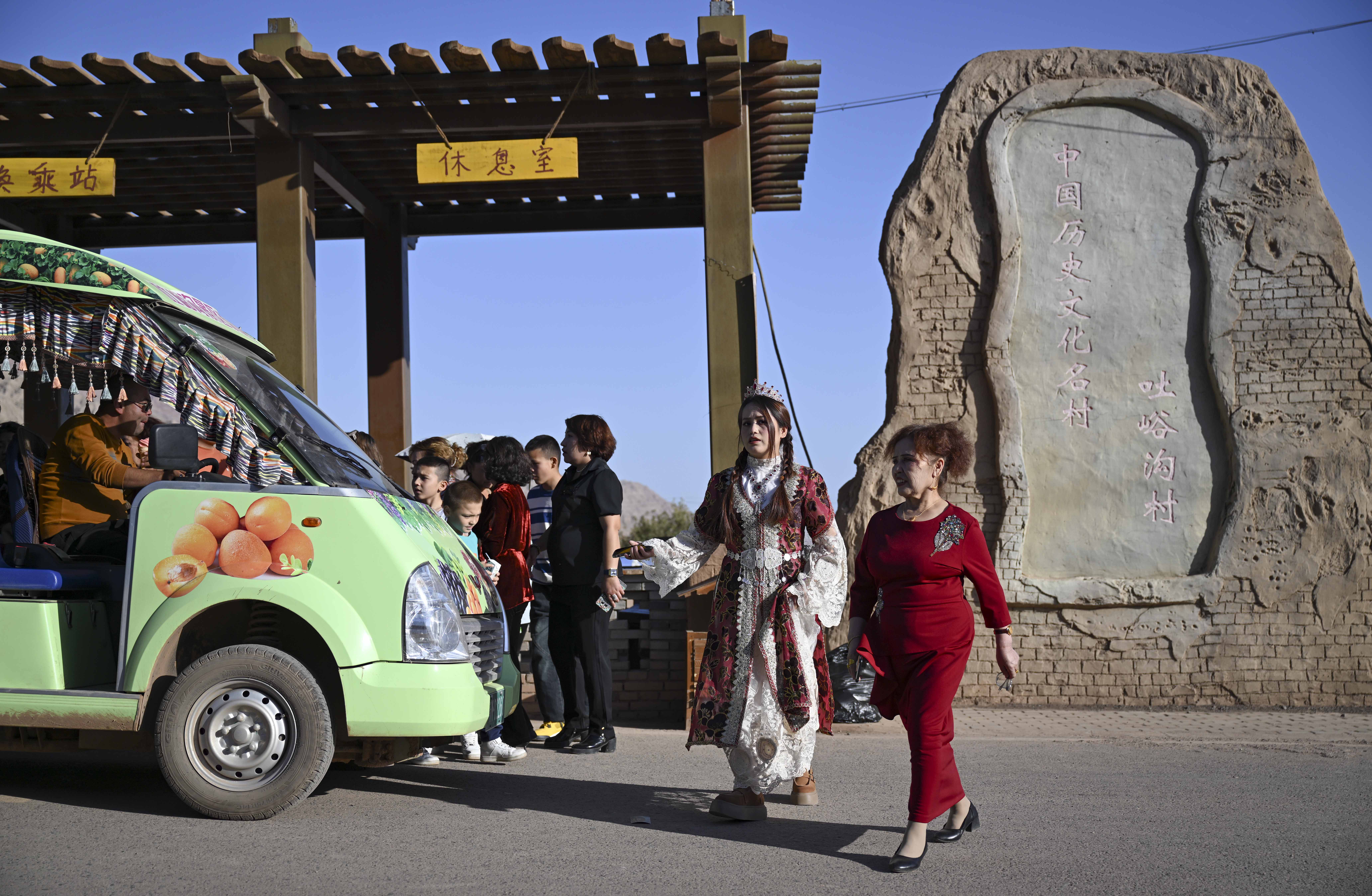 旅拍摄影师走在吐峪沟村(10月6日摄)。