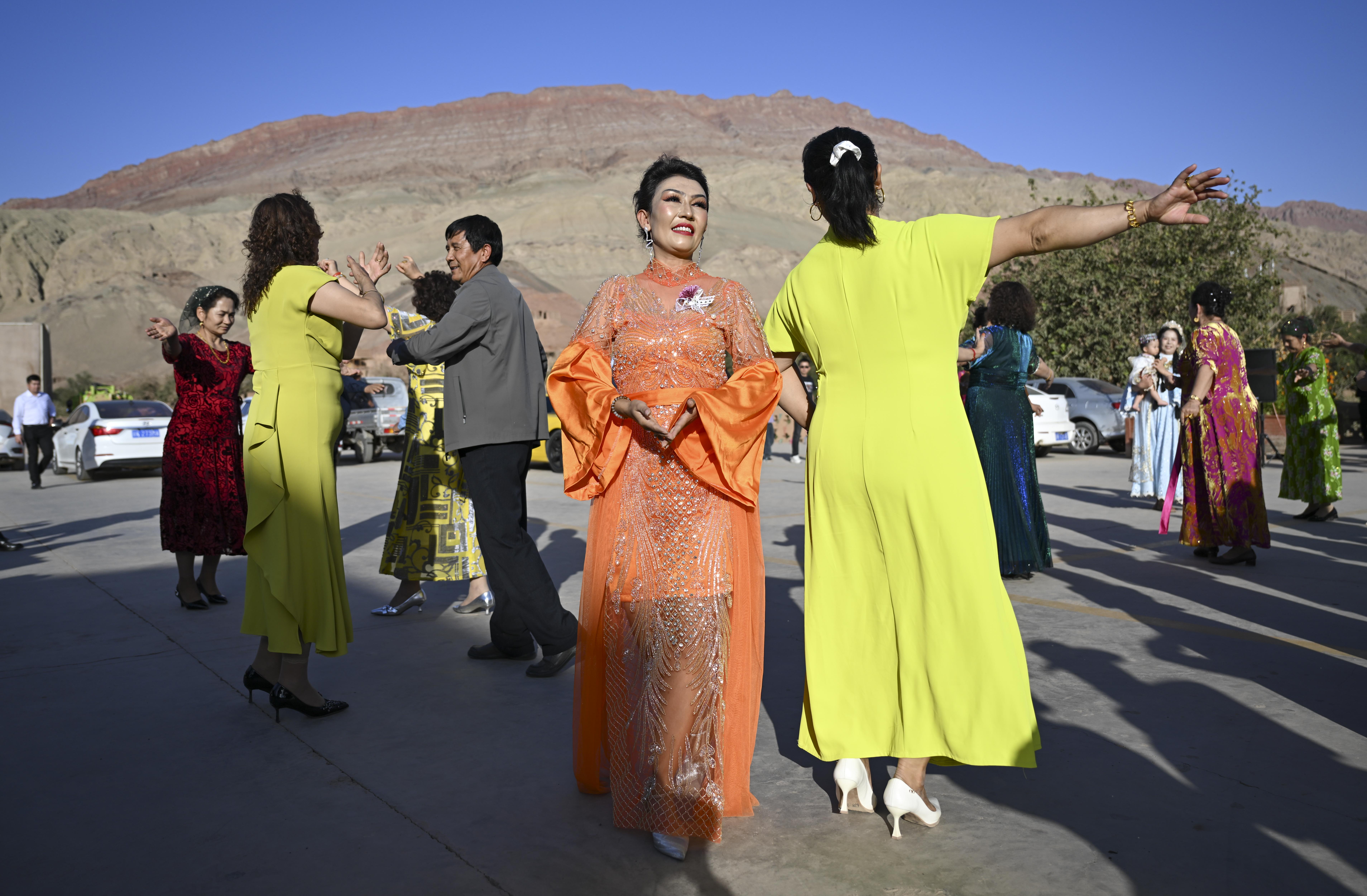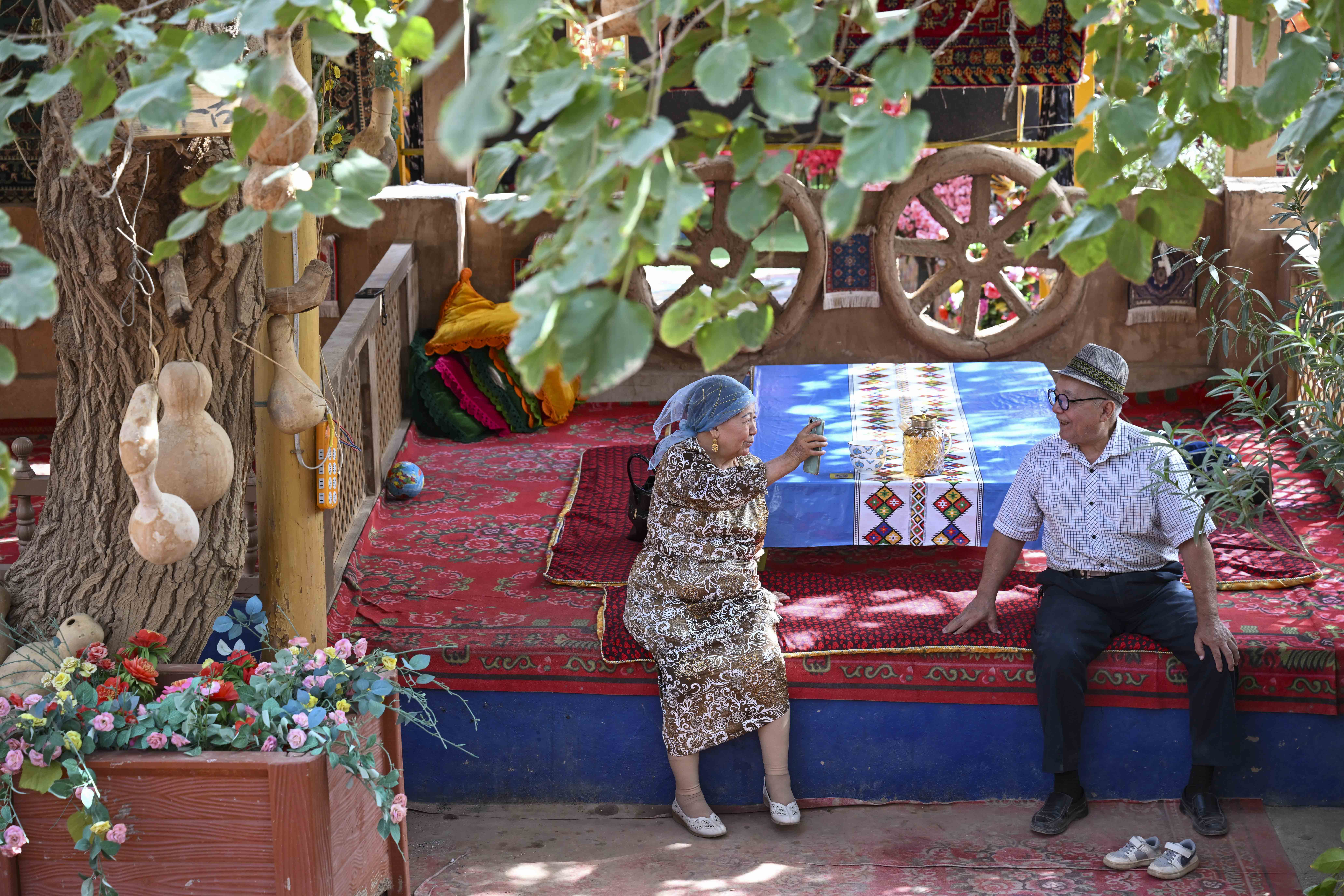 人们在吐峪沟村休息聊天(10月7日摄)。
