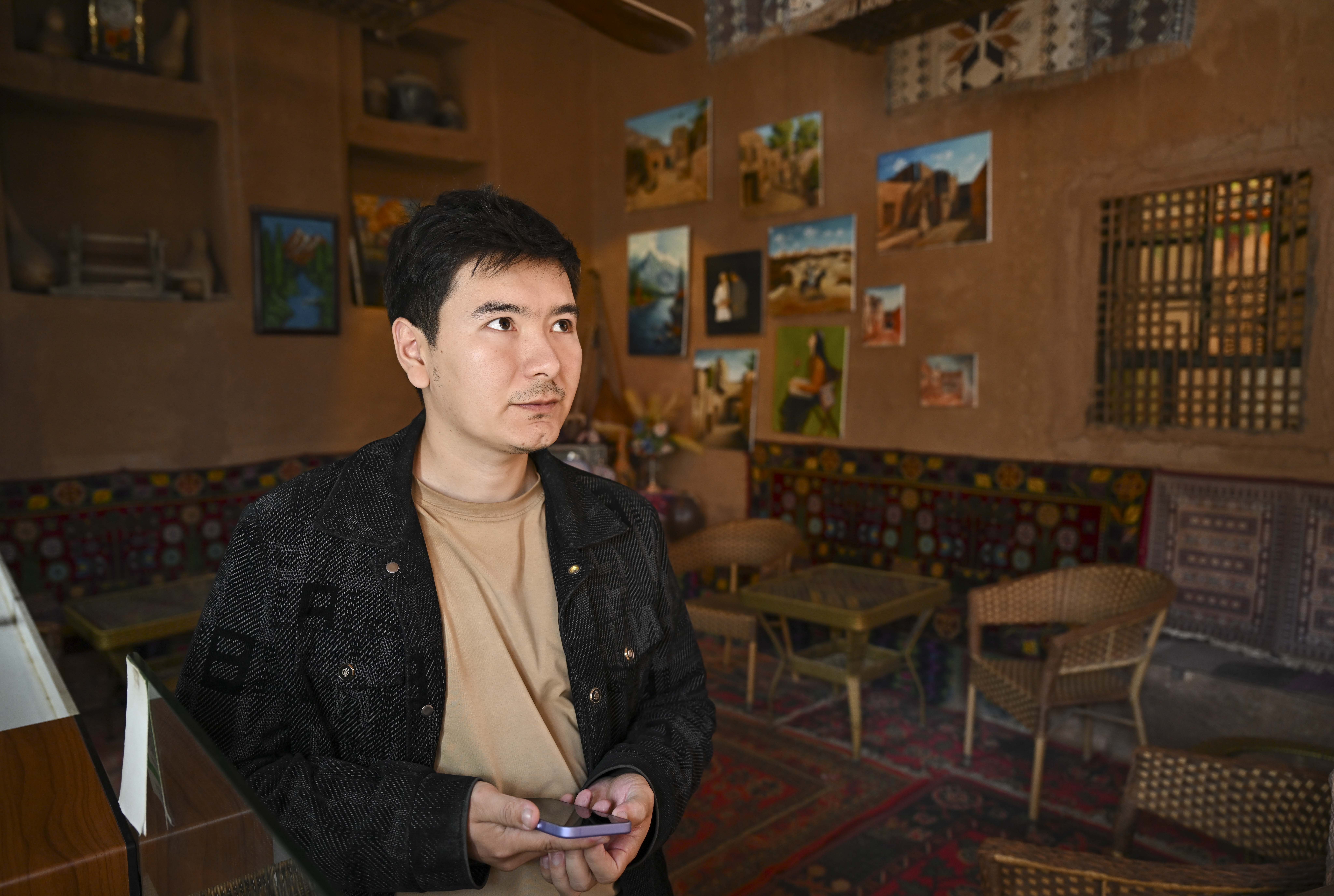 村民努尔买买提·艾合买提在自家经营的饮品店内休息(10月7日摄)。