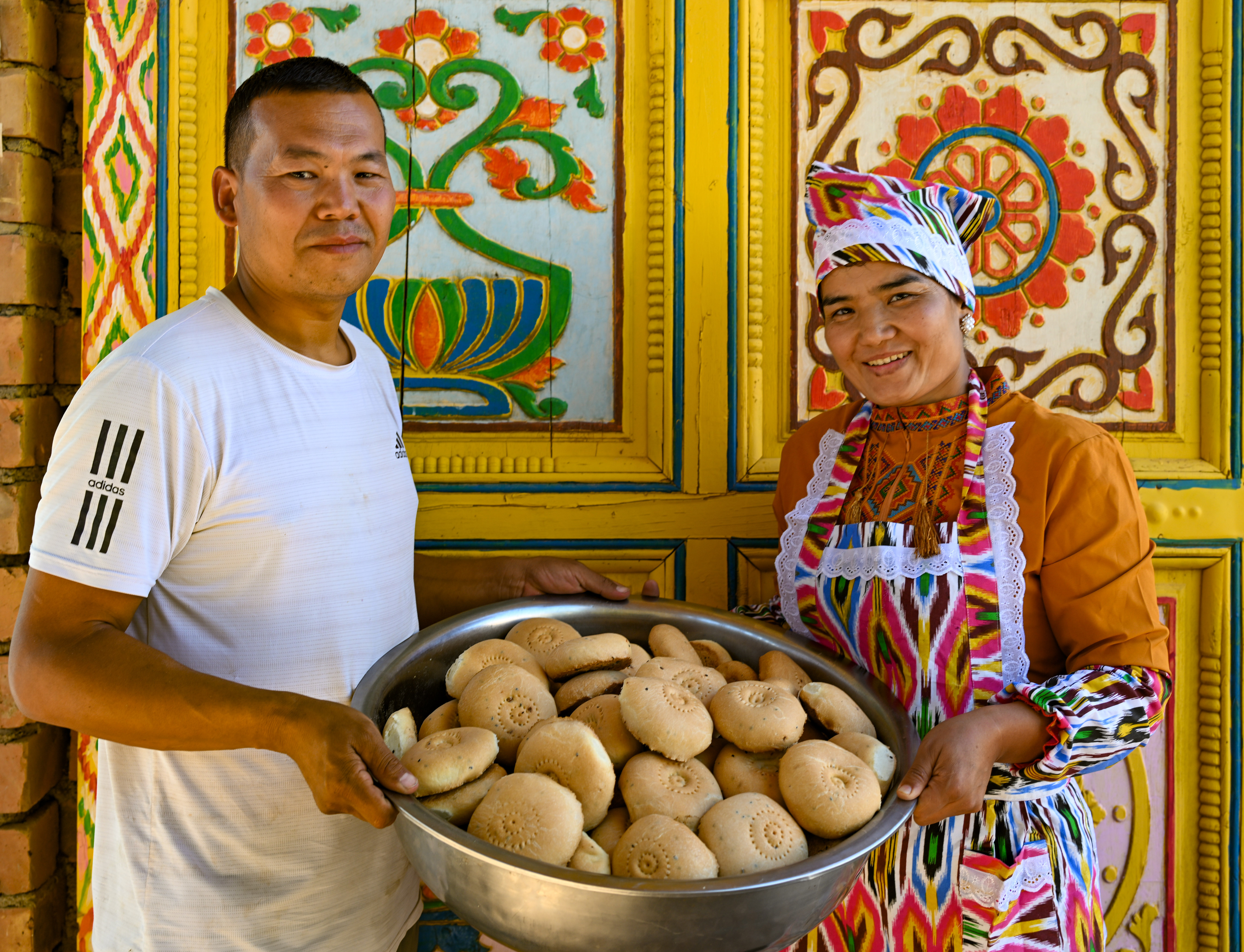 村民艾力·艾孜布力和妻子赛丽米罕·斯迪克展示刚烤制的馕(10月8日摄)。