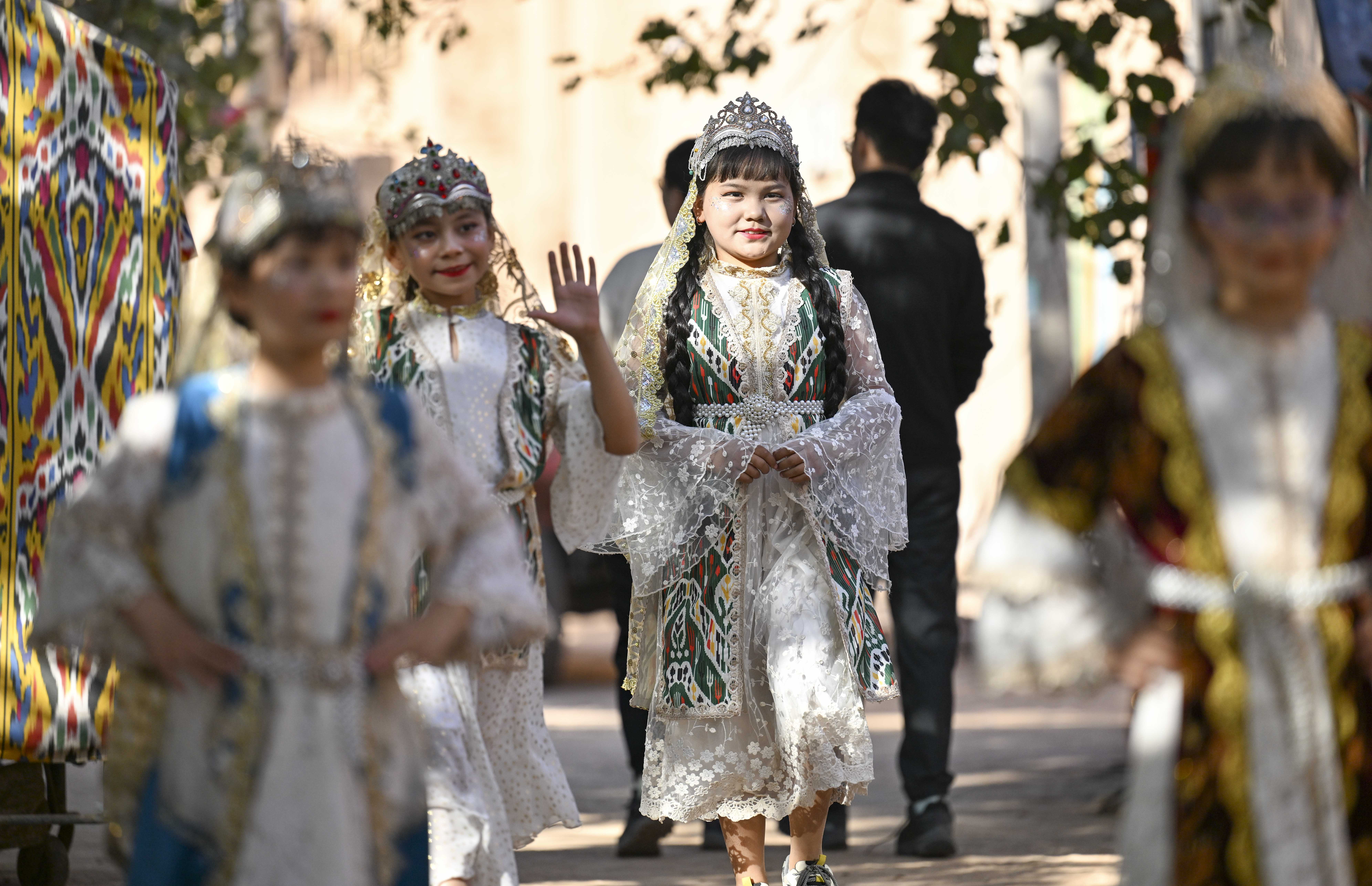 小朋友身着盛装走在吐峪沟村(10月6日摄)。