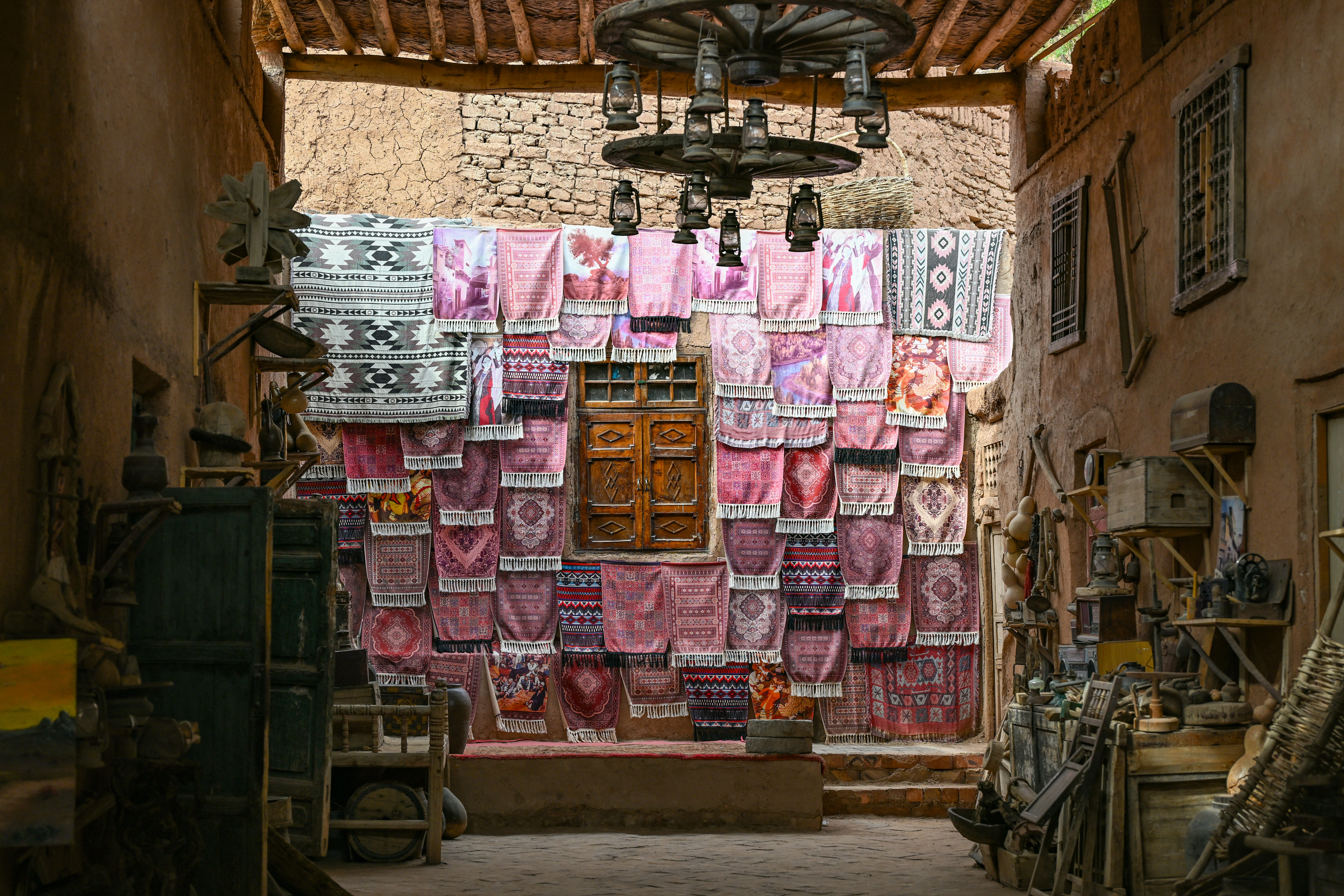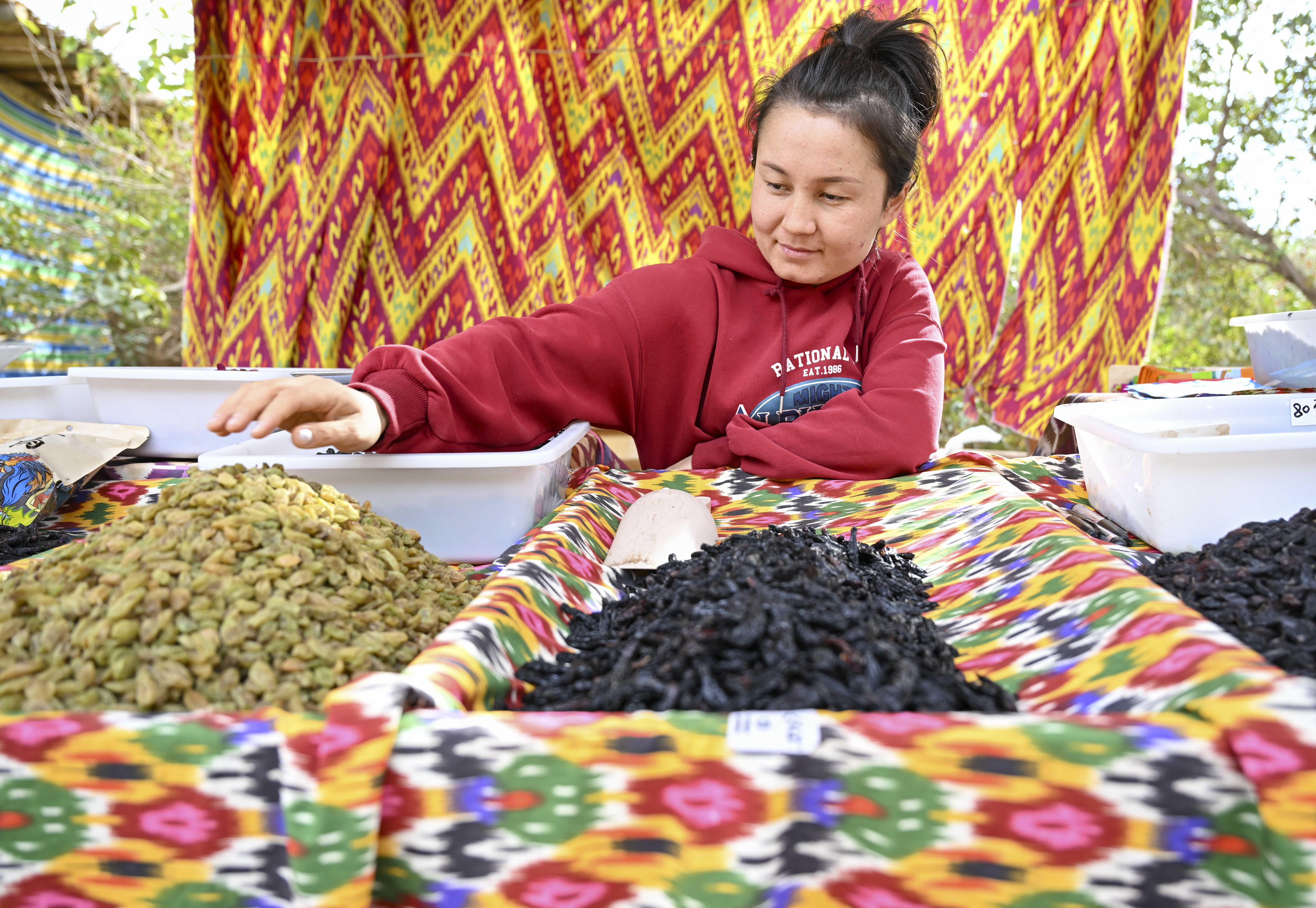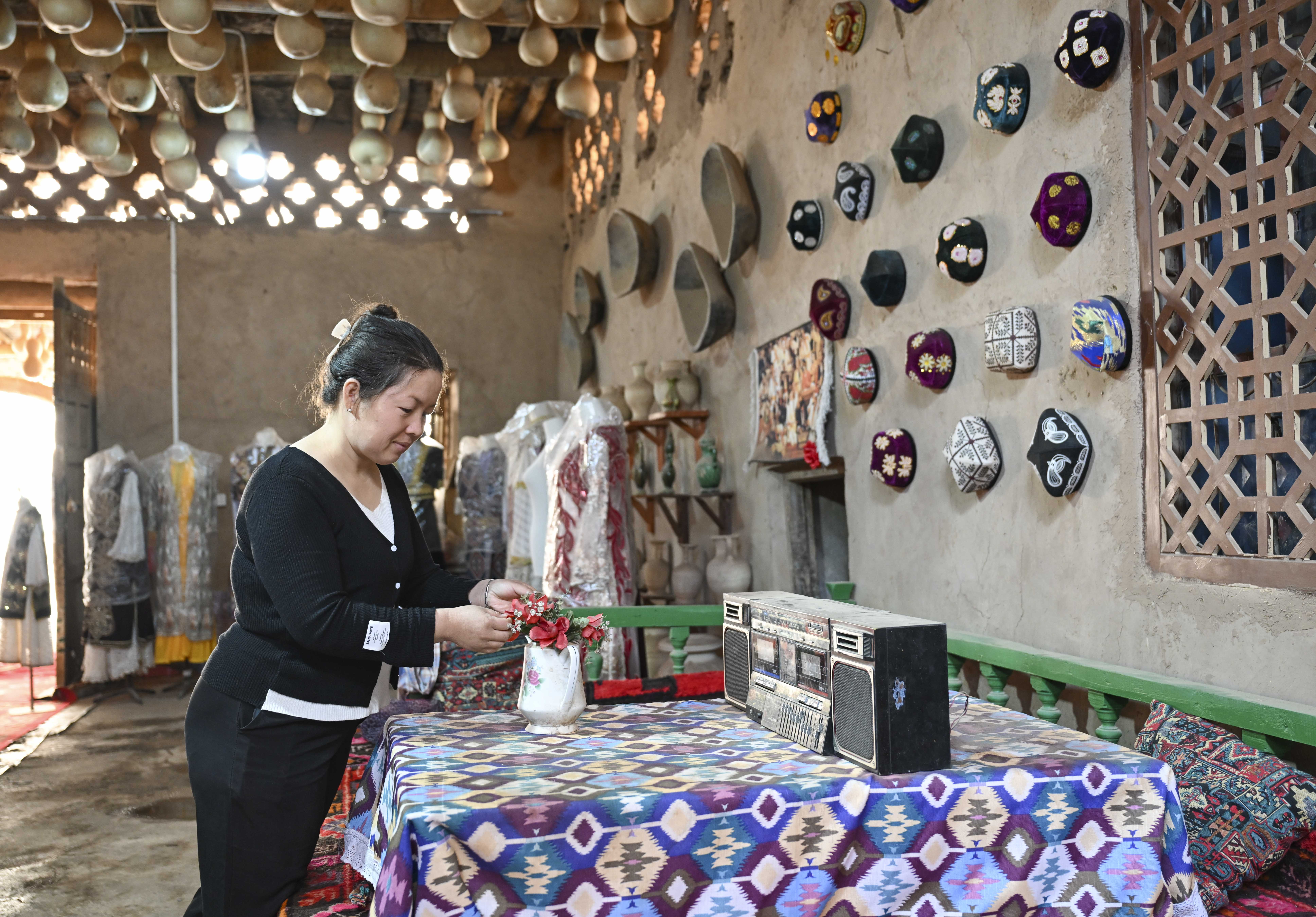 村民在一处修缮好的院落摆摊,售卖干果等特产(10月8日摄)。