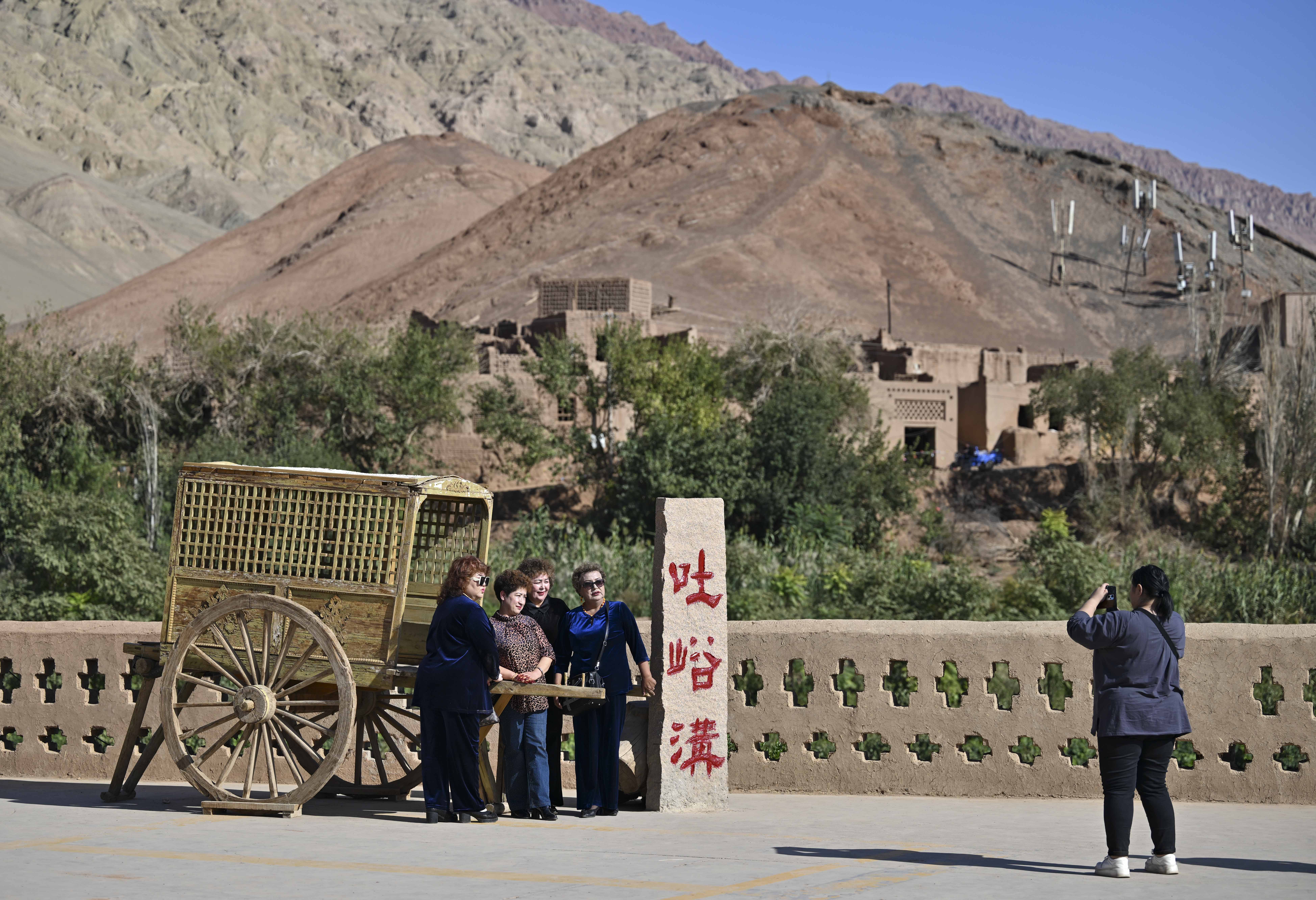 游客在吐峪沟村一处打卡点拍照(10月7日摄)。