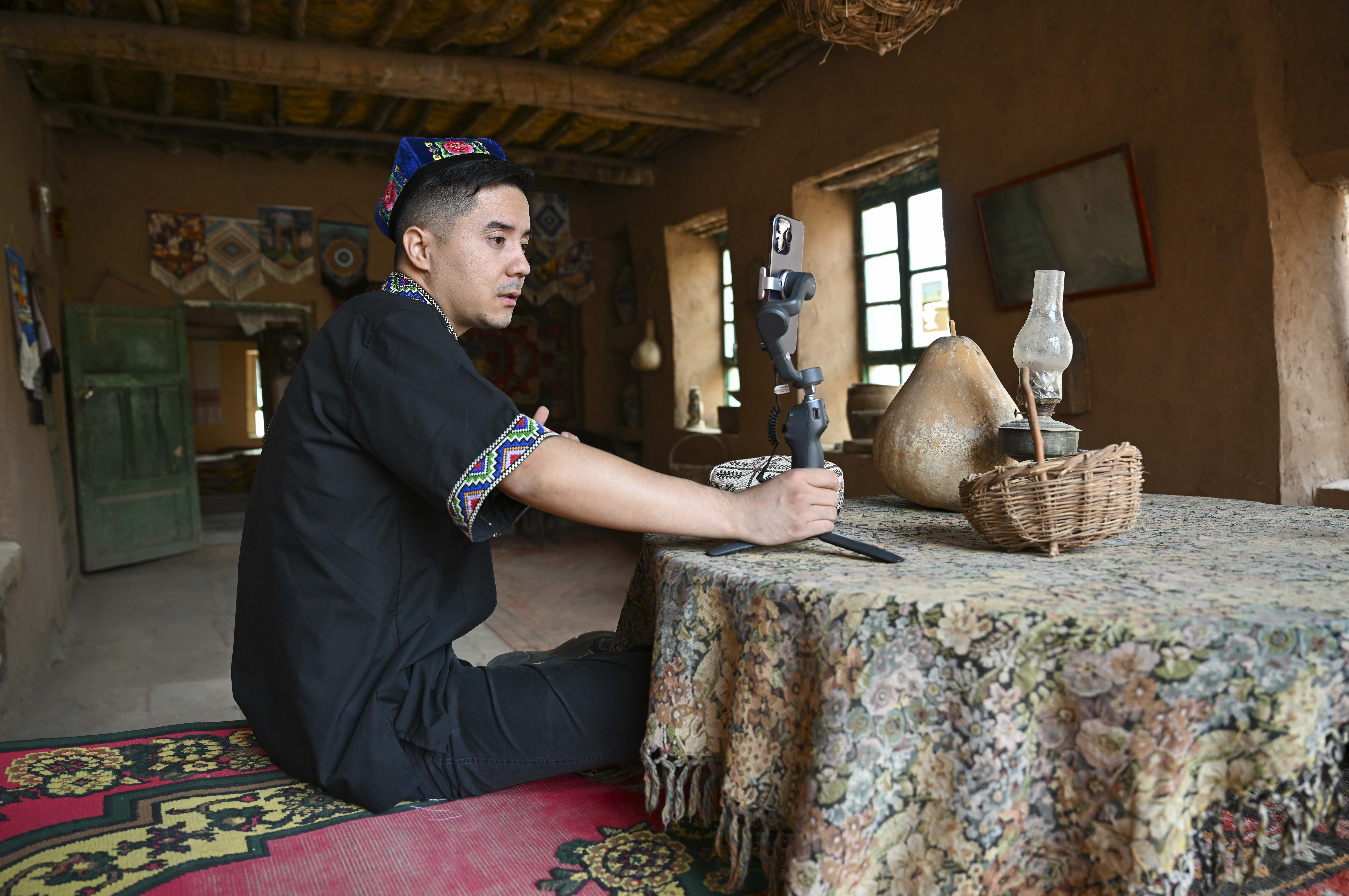 一位青年主播向网友介绍村里的风景、文化、特产等(10月7日摄)。