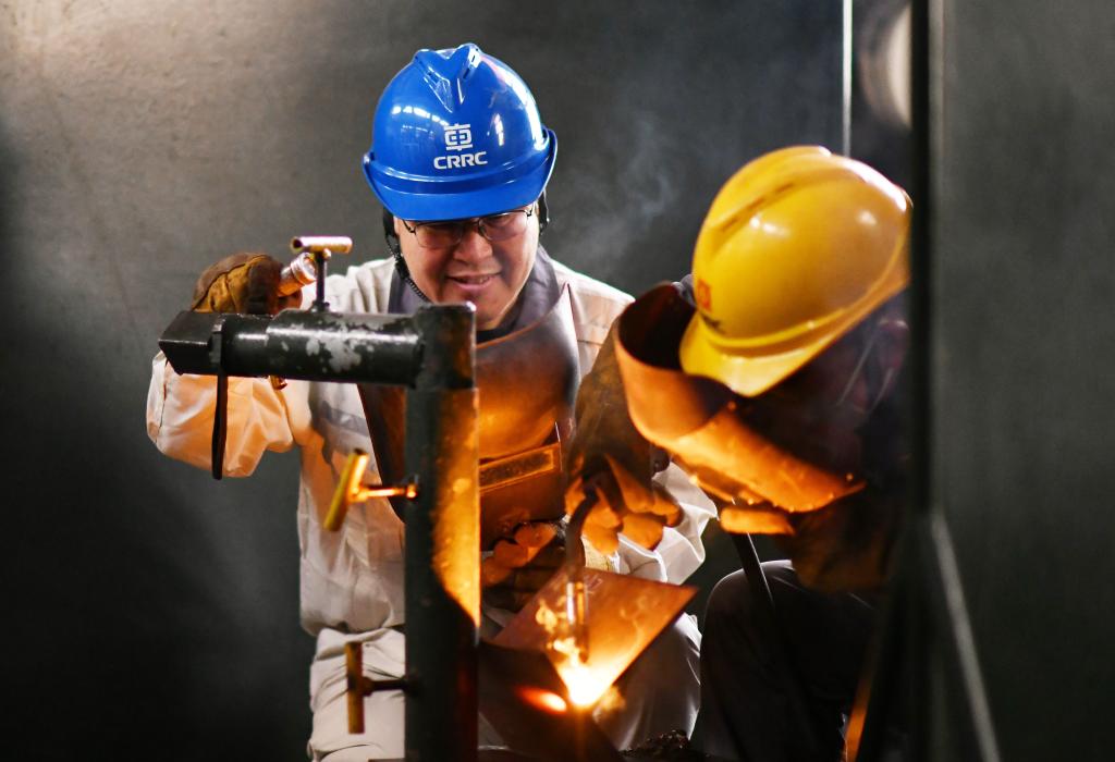 2024年2月4日,中车齐齐哈尔车辆有限公司货车分厂电焊高级技师、高级工程师王海(左)指导徒弟焊接试件。新华社记者 王建威 摄