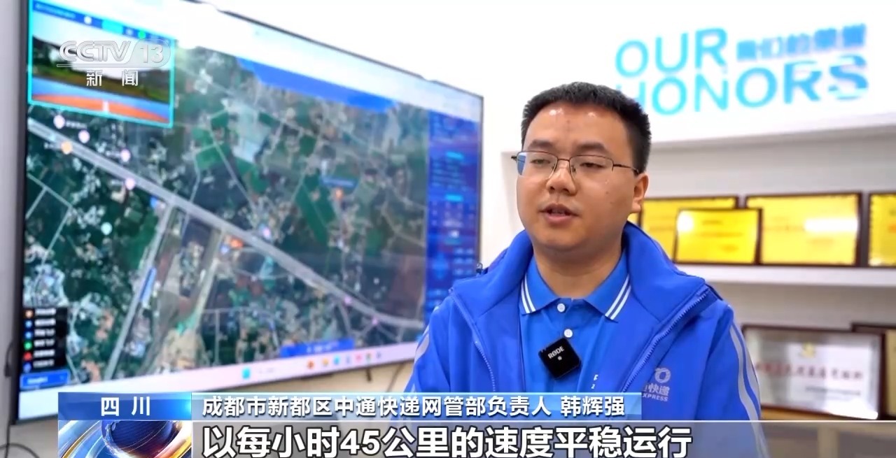 成都市新都区中通快递网管部负责人 韩辉强:我们无人机以每小时45公里的速度平稳运行,相比传统的路面运输方式,运输时间减少了50%以上。