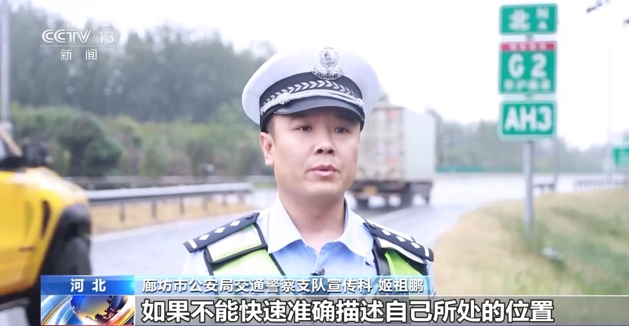 廊坊市公安局交通警察支队宣传科姬祖鹏:在突发情况下,驾驶人在报警时如果不能快速准确描述自己所处的位置,会导致交警无法及时调派施救力量赶到现场,容易导致“二次事故”的发生。
