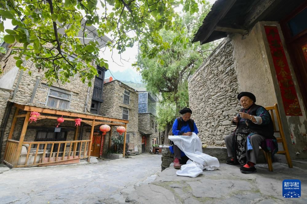 在四川省阿坝藏族羌族自治州理县桃坪村,羌族村民在自家房屋前做针线活(2023年9月13日摄)。新华社记者 王曦 摄