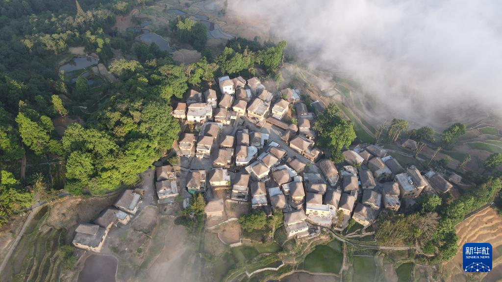 云南省红河哈尼族彝族自治州元阳县阿者科村风光(2024年4月24日摄,无人机照片)。新华社发(张艳 摄)