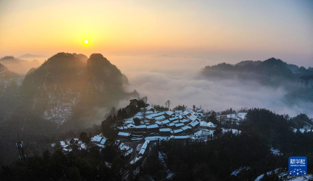 湖南省湘西土家族苗族自治州花垣县双龙镇十八洞村雪后景色(2022年2月24日摄,无人机照片)。新华社发(龙恩泽 摄)