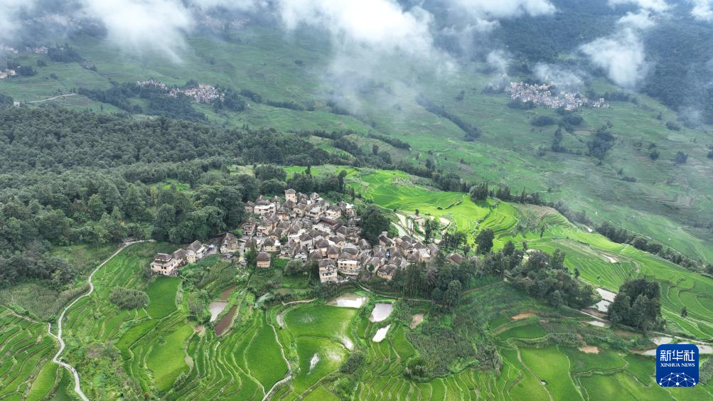 云南省红河哈尼族彝族自治州元阳县阿者科村风光(2024年7月19日摄,无人机照片)。新华社发(张艳 摄)