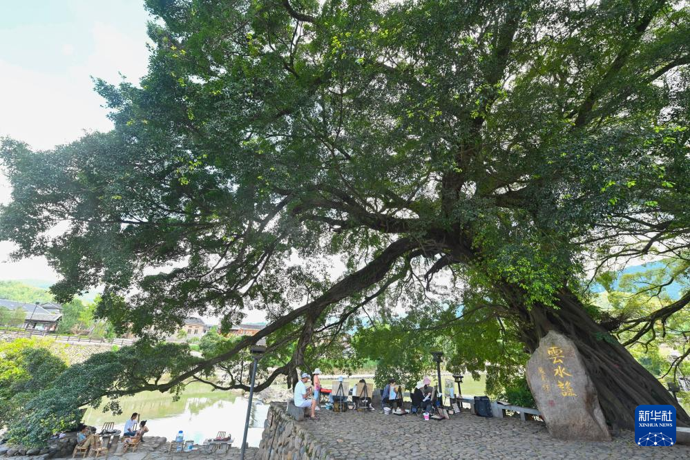 在福建省漳州市南靖县书洋镇官洋村云水谣景区,学生和游客在榕树下写生(2021年8月17日摄)。新华社记者 宋为伟 摄