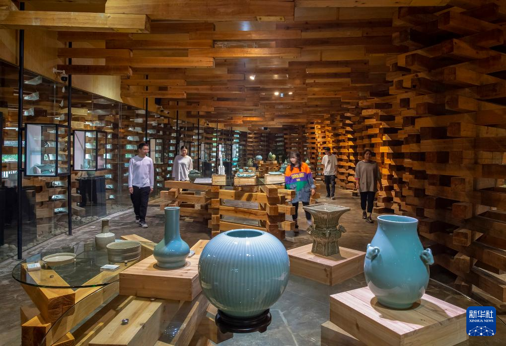 浙江省丽水市龙泉市溪头村“国际竹建筑双年展”上展示的龙泉青瓷(2023年5月13日摄)。新华社发(张有钢 摄)