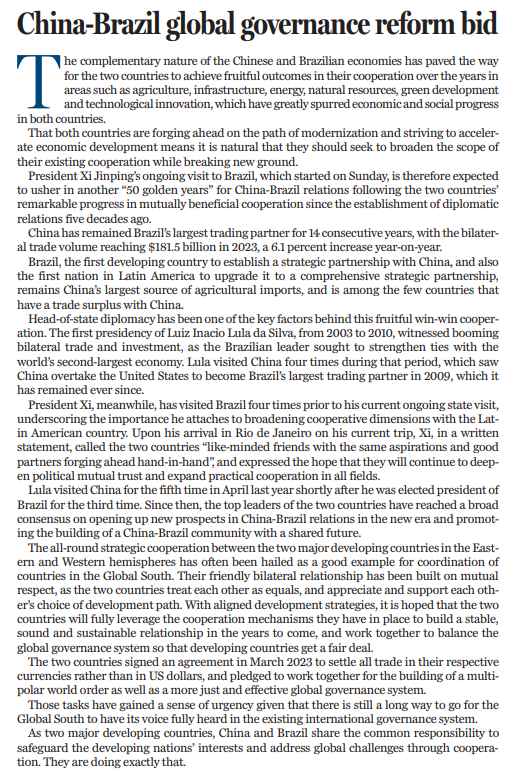 作为东西半球两大发展中国家,中巴全面战略合作被誉为“全球南方”国家团结合作、携手发展的典范。中巴在国际舞台上携手合作、共同发声,必将进一步壮大“全球南方”力量,推动全球治理体系朝着更加公正合理的方向发展,为世界和平稳定和共同发展作出中巴贡献。