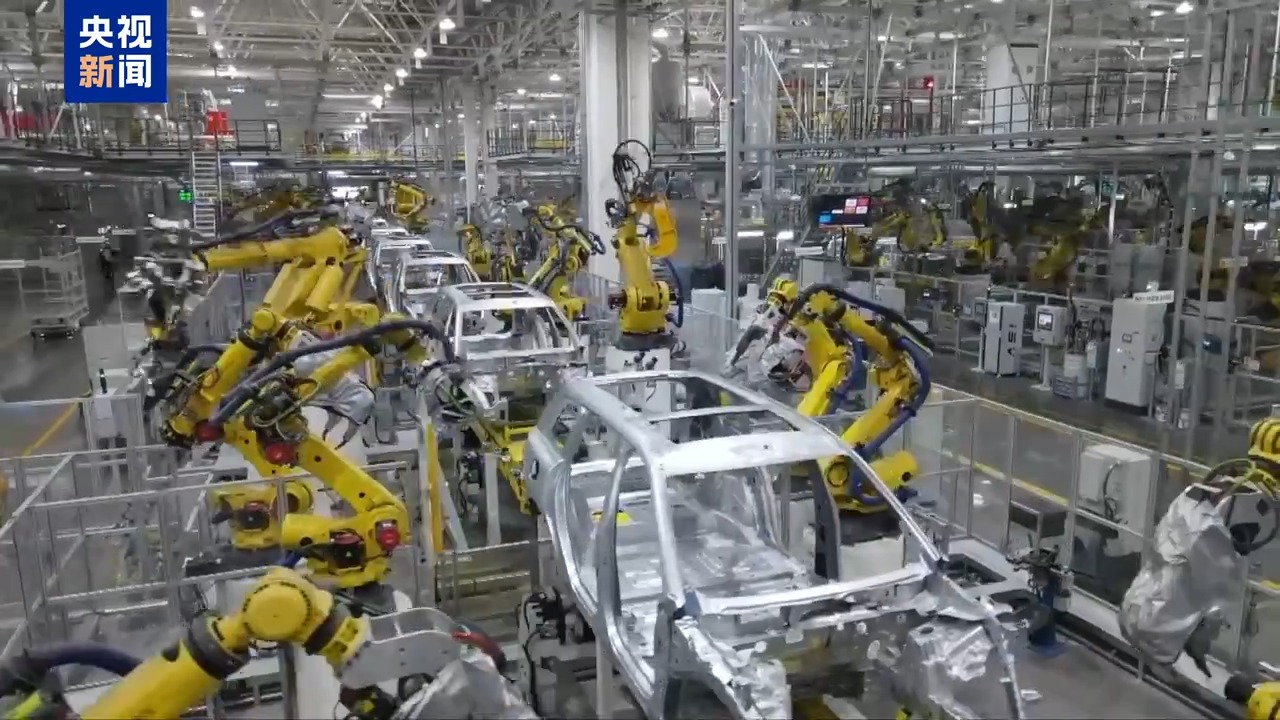 总台央视记者 李厦:流程多长?我带你看看去!这里就是一座新能源车的超级工厂,看,这里配备了超过1600台智能终端和3000多台机器人,它们智能协同工作,关键生产工序实现了100%自动化。这个繁忙的产线,几分钟就能有一台新能源车下线。