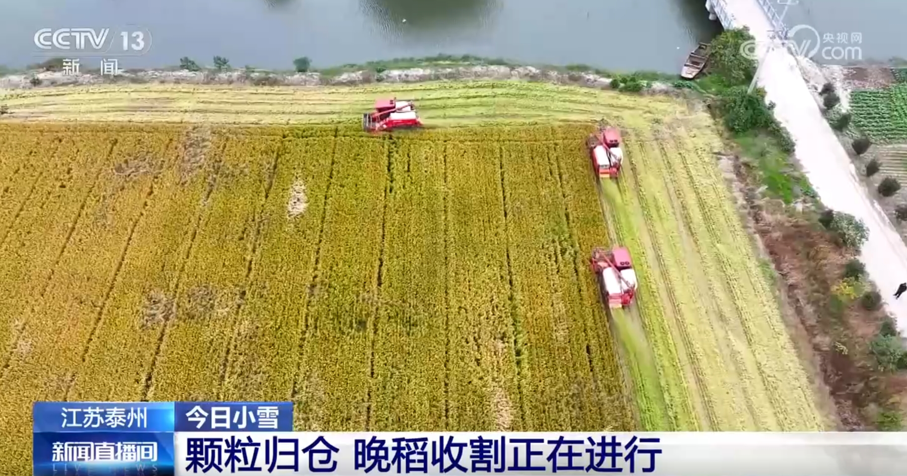 我们现在看到的是江苏泰州正在进行的晚稻收割作业。这个时候,当地早稻和中稻已经收获完成,收割机正开足马力进行晚稻收获,割穗、脱粒、粉碎秸秆,一气呵成,连倒伏的稻穗也被采收干净,金黄饱满的稻谷顺着管道倾泻而下,颗粒归仓。