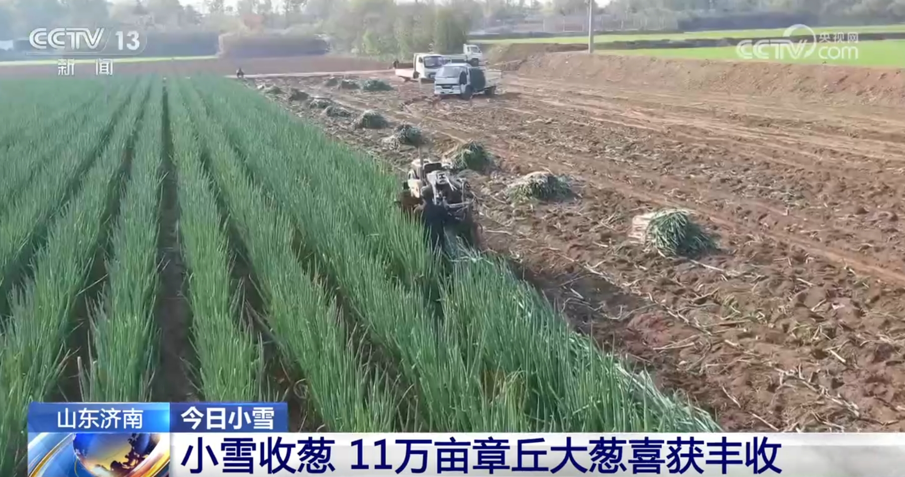俗语说“小雪收葱,不收就空”,小雪节气是北方大葱收获的时候。在山东济南,这里自古就有种植大葱的传统,眼下11万亩章丘大葱喜获丰收,村民们正忙着收葱、卖葱,种植基地里,大葱收获机的应用大大提高了采收效率。