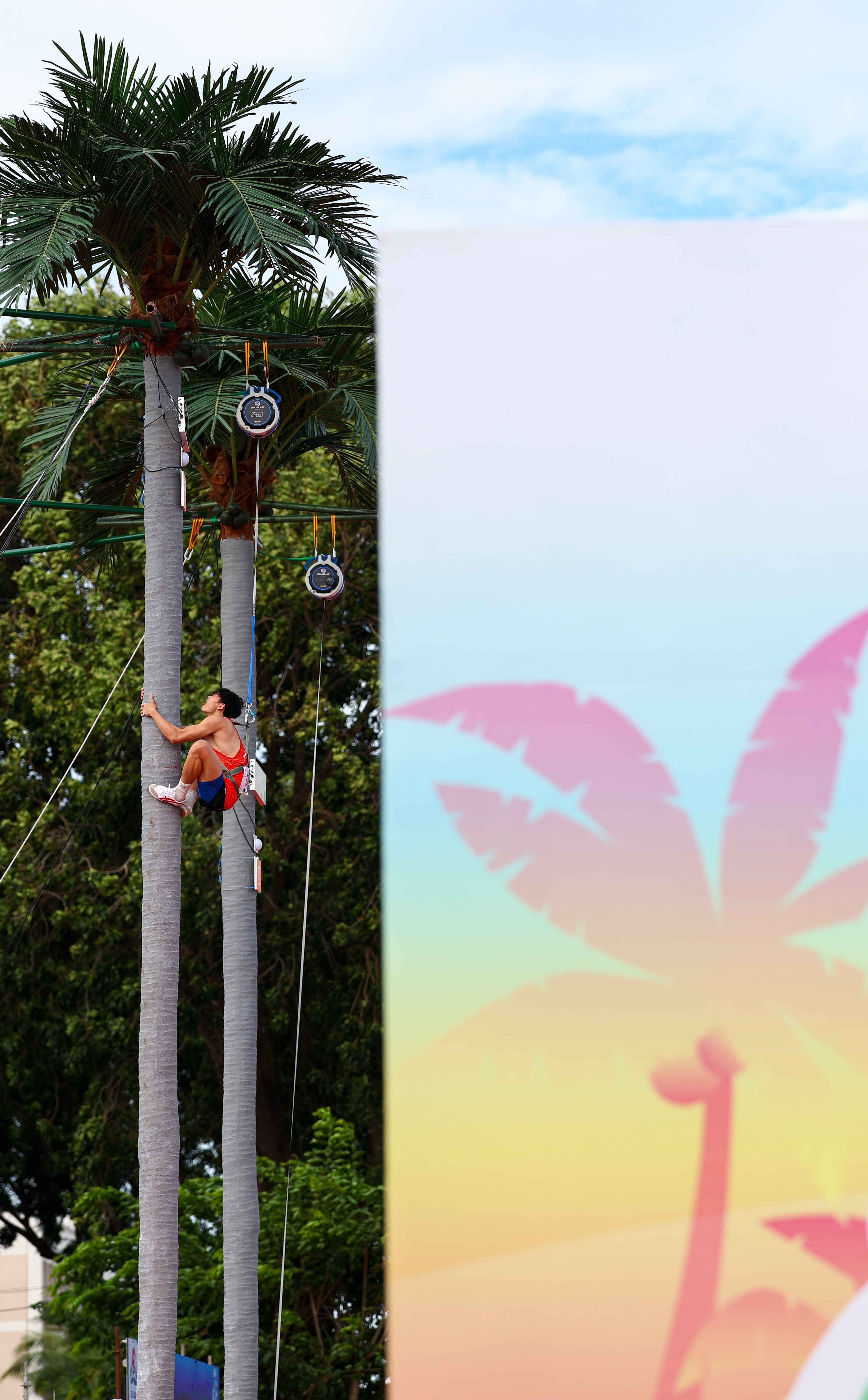 相比在运动会上历史悠久的龙舟,当日上演的攀椰竞速则是在本届赛事首次撞入人们的眼帘。在椰子树上手脚并用攀爬,迅速抵达顶端,不问可知,这一竞技性与趣味性兼具的运动脱胎于海南当地群众传统的徒手爬树摘椰子场景。