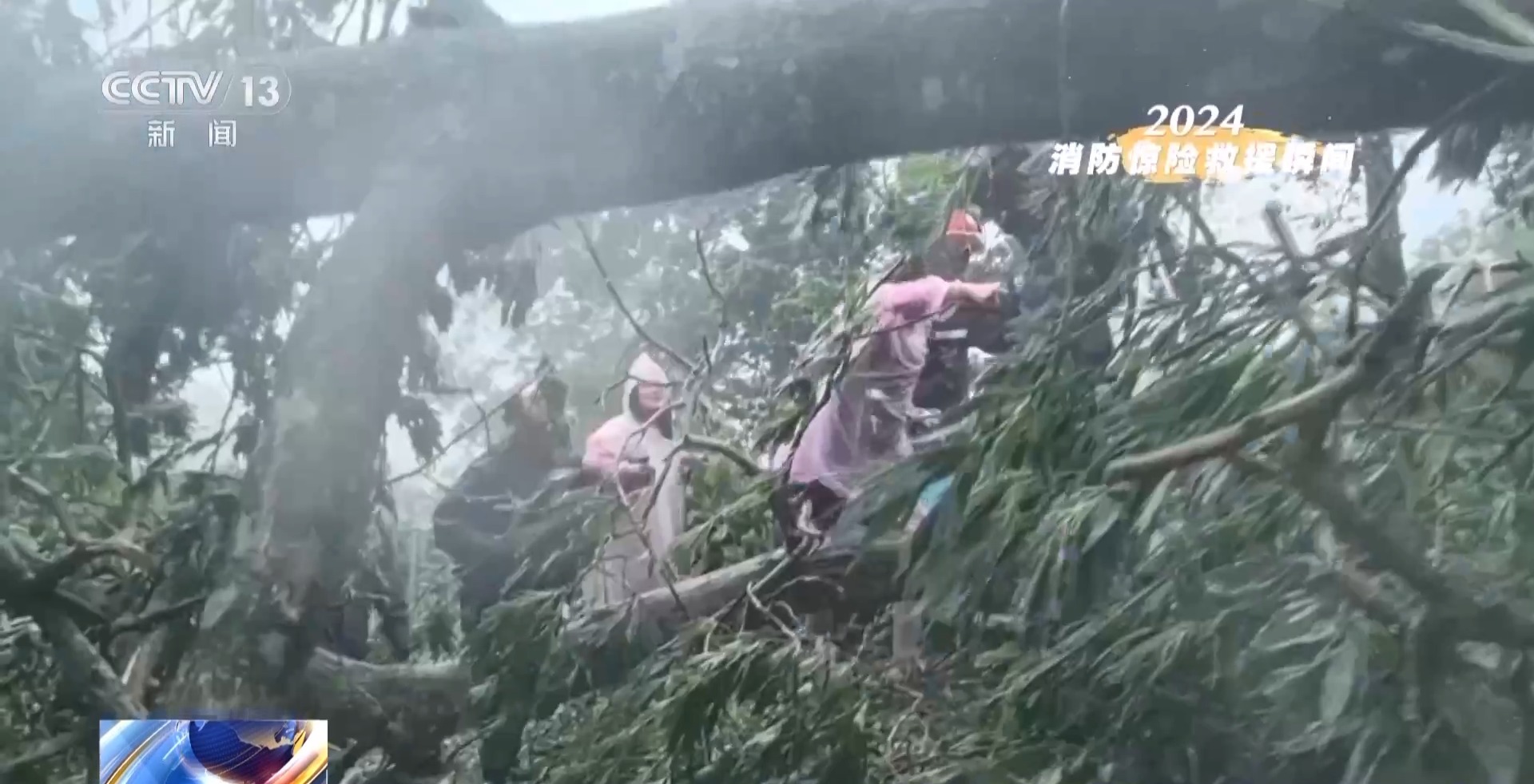 消防员一边摸索探路,一边清除障碍,在扑面打来的风雨中搜寻被困者。