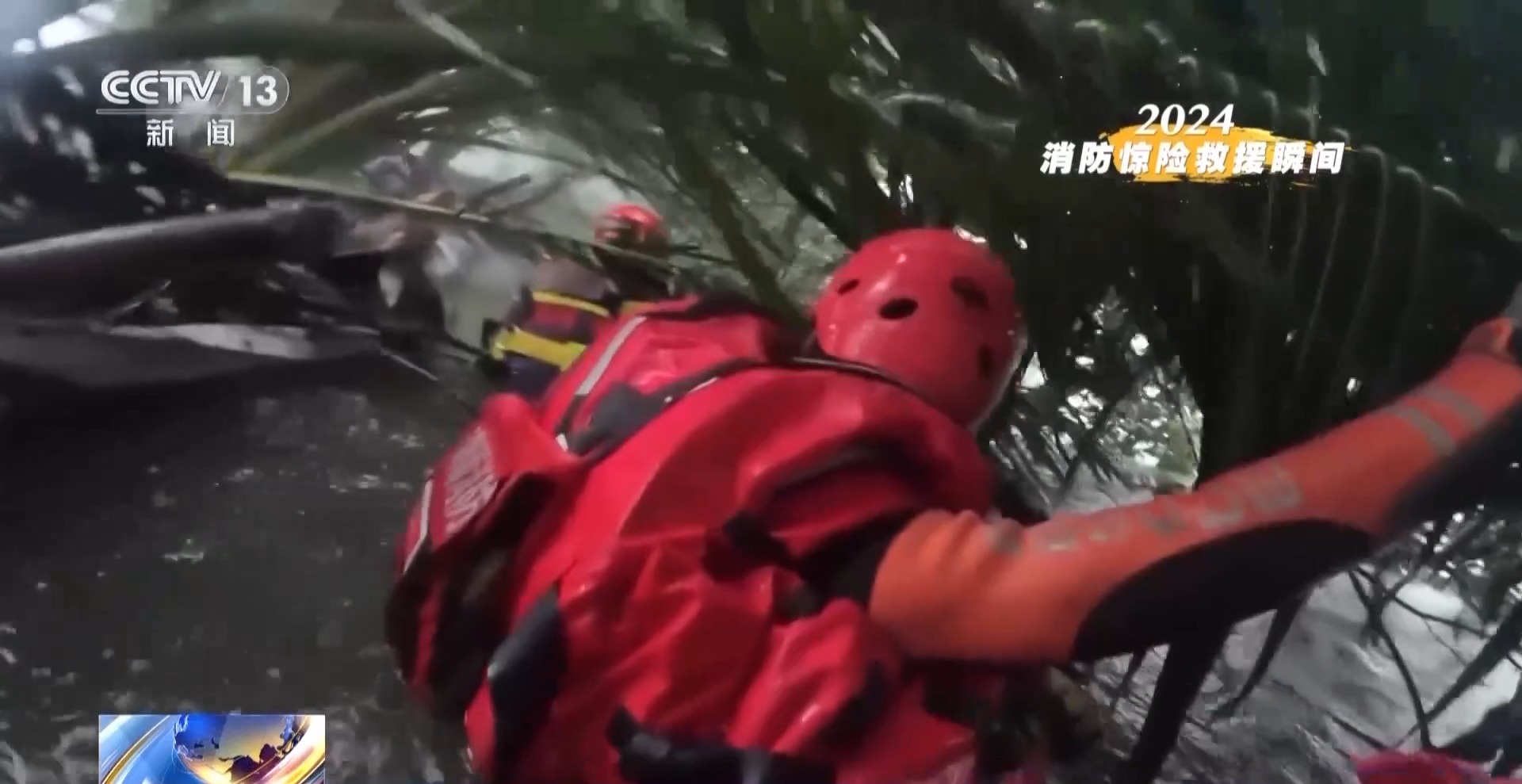 这是超强台风“摩羯”登陆后第10分钟,正处于12级风圈。人几乎无法站立,消防员还要穿越陡坡,到椰林里寻找被困人员。
