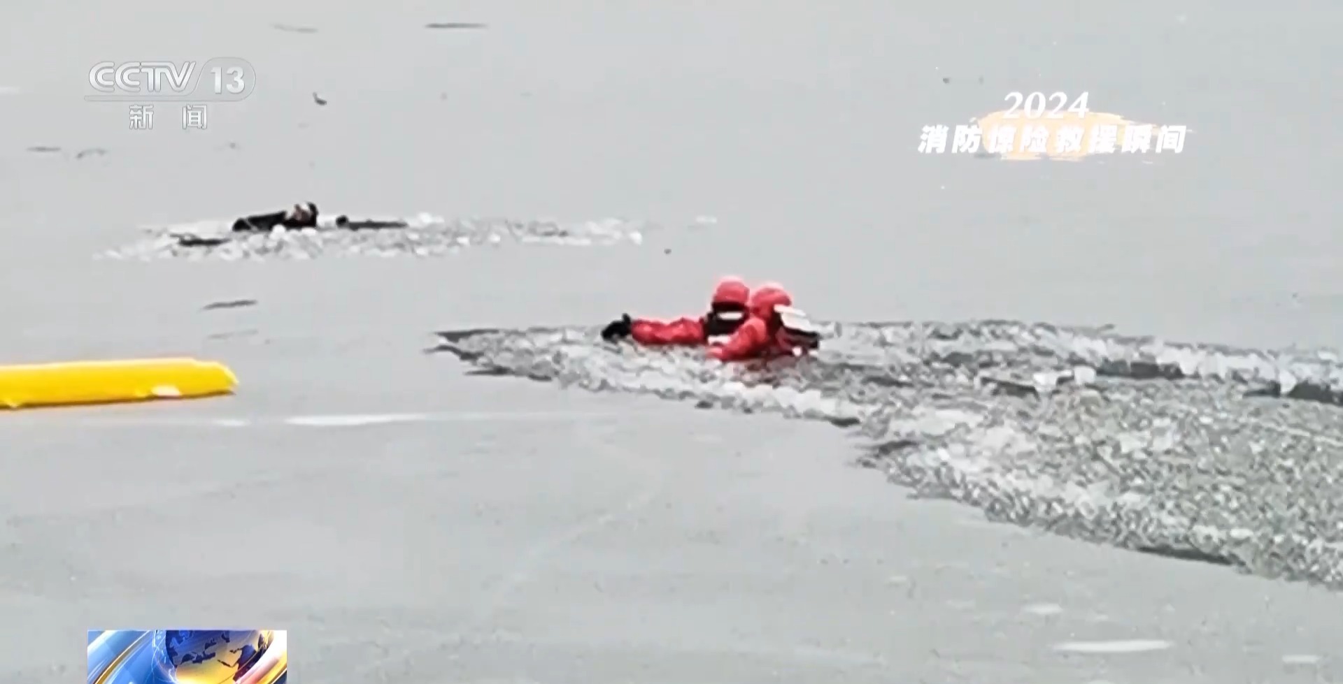 冰水的浸泡已经使落冰者失去了行动能力,只能靠消防员拖拽向前。几名消防员拼尽最后的力量终于将落冰者拉回岸边。