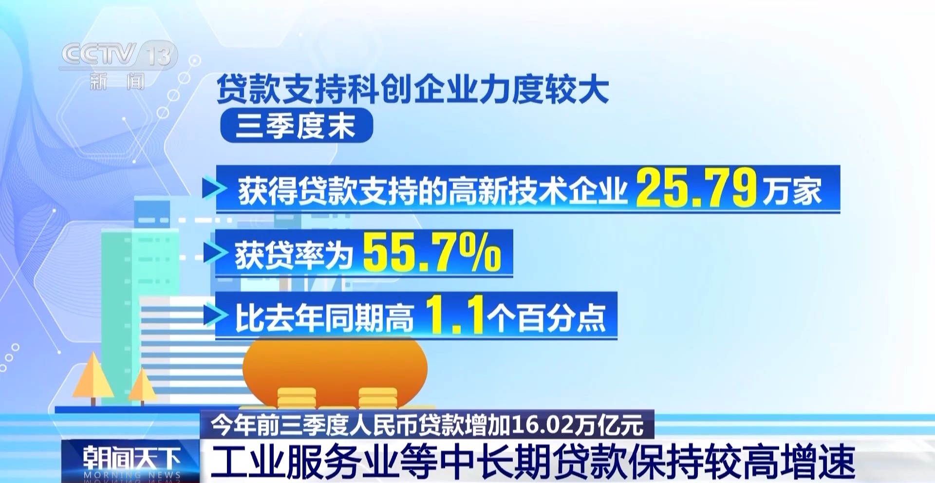 贷款支持科创企业力度较大。三季度末,获得贷款支持的高新技术企业25.79万家,获贷率为55.7%,比去年同期高1.1个百分点。高新技术企业本外币贷款余额16.03万亿元,同比增长9%,增速比各项贷款高1.4个百分点。