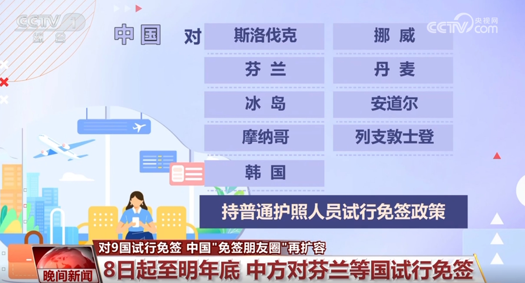我国对斯洛伐克、挪威、芬兰、丹麦、冰岛、安道尔、摩纳哥、列支敦士登、韩国持普通护照人员试行免签政策。从今年11月8日起到明年底,上述国家持普通护照人员来华经商、旅游观光、探亲访友和过境不超过15天,可免签入境。
