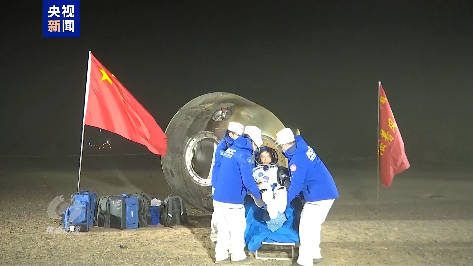 11月4日凌晨,内蒙古额济纳旗大漠深处,天边划过的这颗星,正是按照计划返回地球的神舟十八号飞船。1时24分,神舟十八号飞船顺利着陆。5分钟后,搜救回收分队的队员就到达了飞船边,在完成必要的工作后,三位航天员陆续出舱。