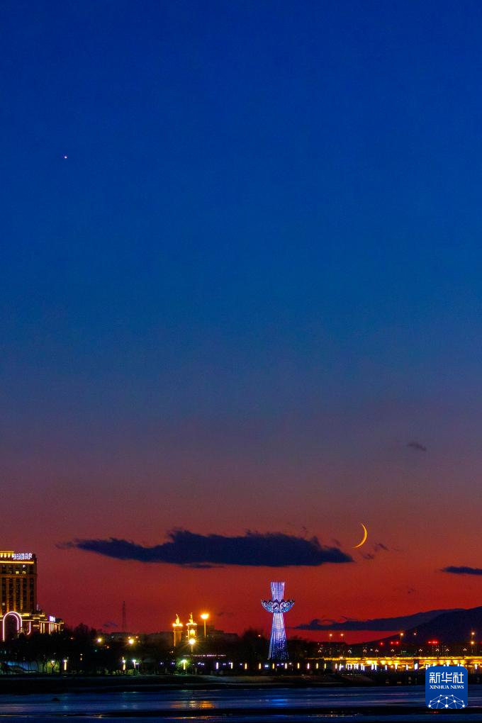 近期,金星重新回归傍晚的夜空之中,且随着时间的推移,其地平高度也逐渐升高,可观测时间也越来越长,这也意味着每个月的月球经过金星附近时,都能组成一幅“金星伴蛾眉”的画面。本月的4日和5日傍晚,就是欣赏金星伴月的好时机。新华社发(王宝勋摄)
