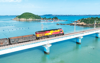装运铁矿石的海铁联运班列经过福建莆田湄洲湾港罗屿作业区附近的一座桥梁。新华社记者 林善传 摄
