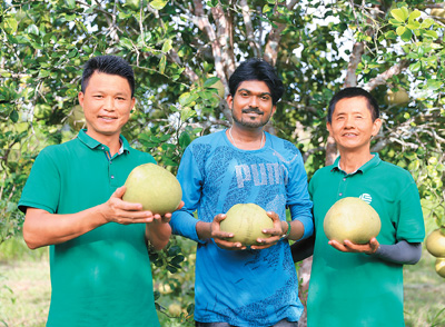 在苏里南萨拉马卡区农户阿什温·杜基家的果园里,中国援苏里南农业技术合作中心的农艺师杜时云(左)、刘经国(右)与农户杜基合影。新华社记者 李梦馨 摄