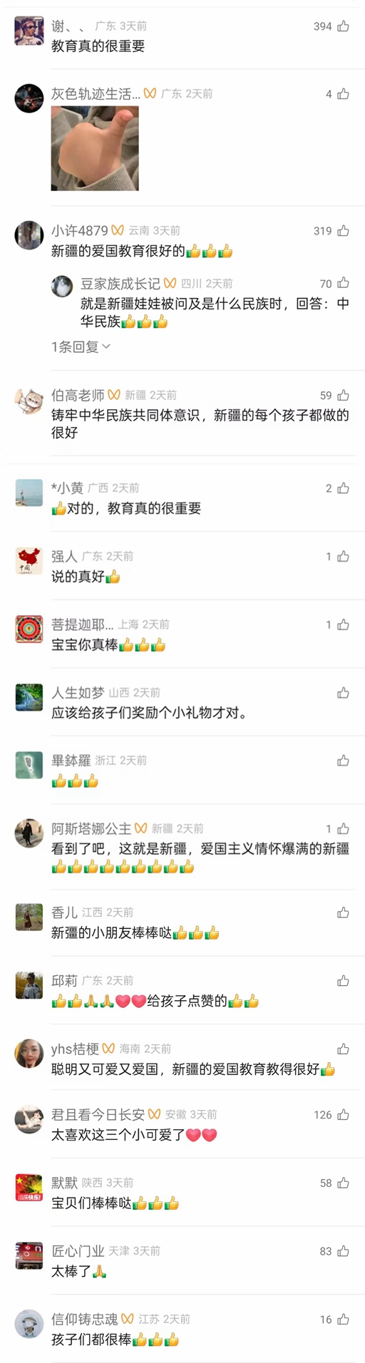 短短几句对话,让人感受到了新疆小朋友们对祖国发自内心的热爱之情。视频发布后,大量网友为孩子们点赞,也有网友评论:“说的太好了”“孩子们都很棒”……