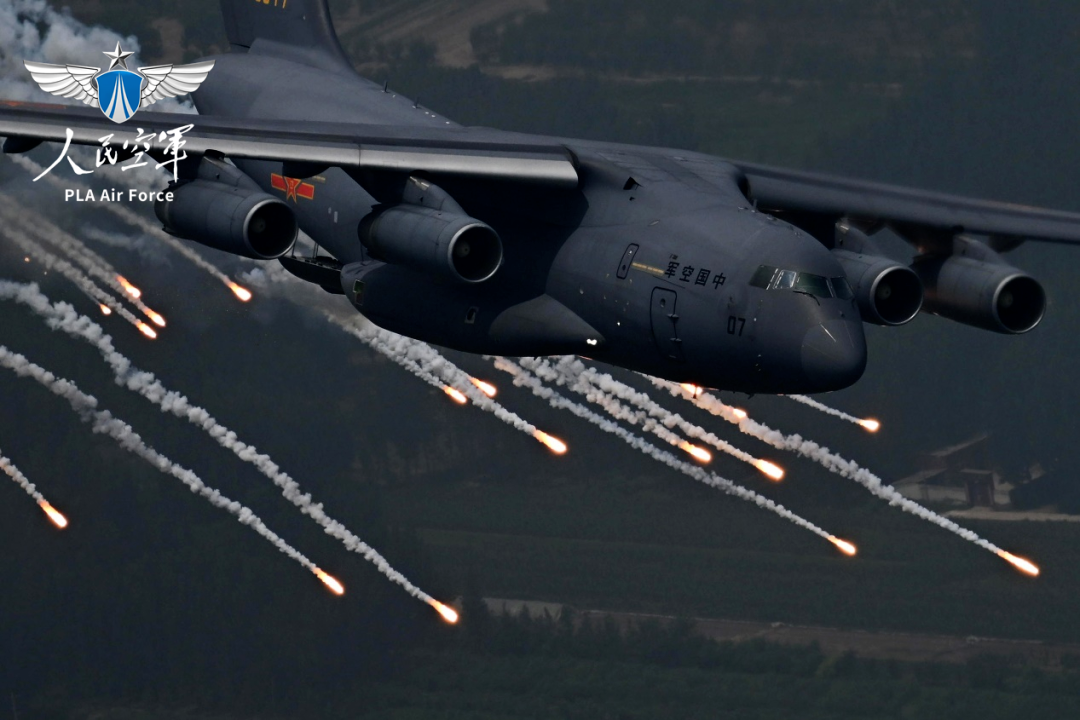 2022年7月14日,运- 20运输机释放干扰弹,模拟规避“敌”攻击。