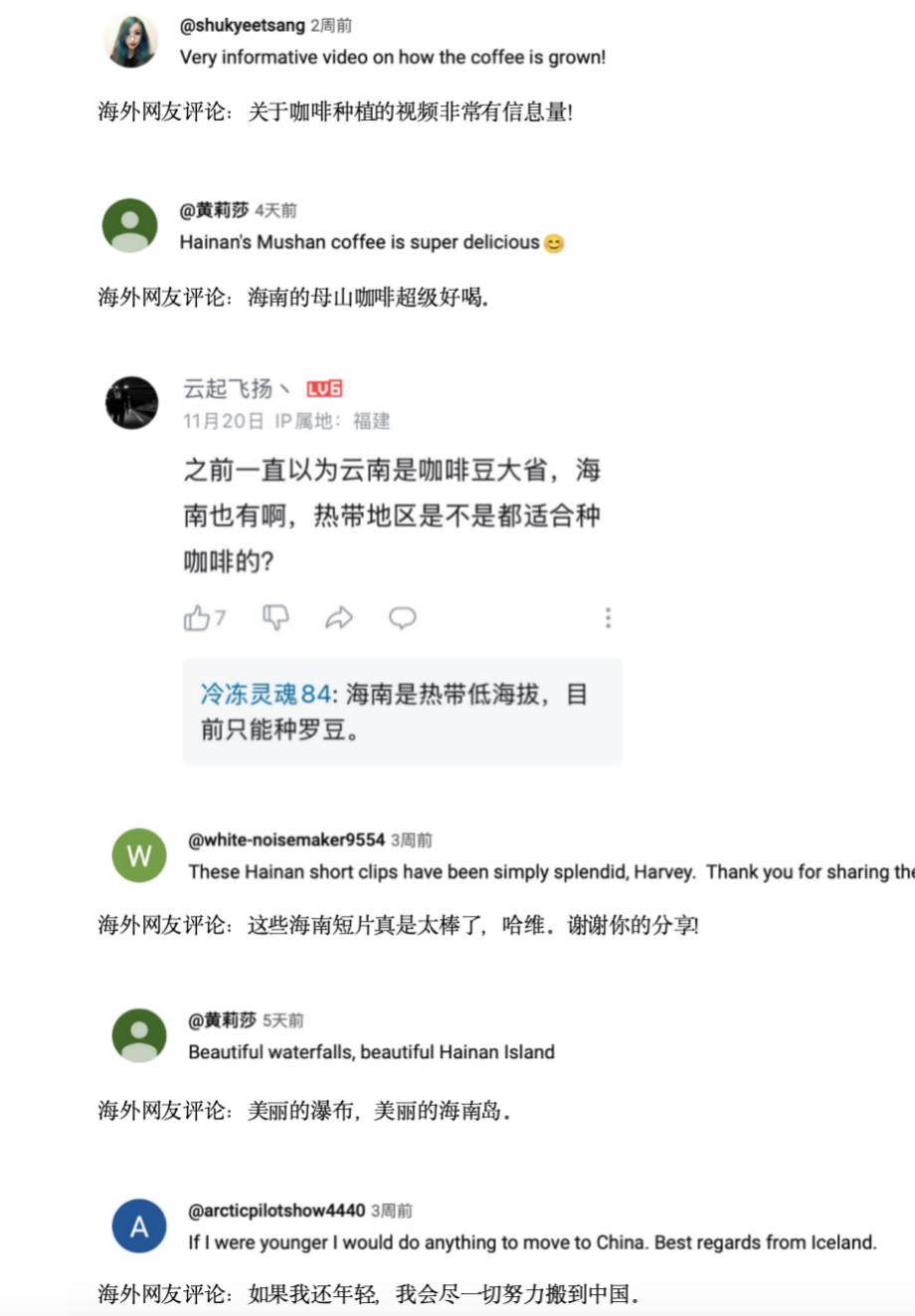 除了旅游风光,哈维在视频中还科普了海南的产业文化。在参观母山咖啡种植园时,他记录了从咖啡豆采摘到成品的全过程。有网友评论道:“之前一直以为云南是咖啡豆大省,原来海南也有啊!”“关于咖啡种植的视频非常有信息量!”。