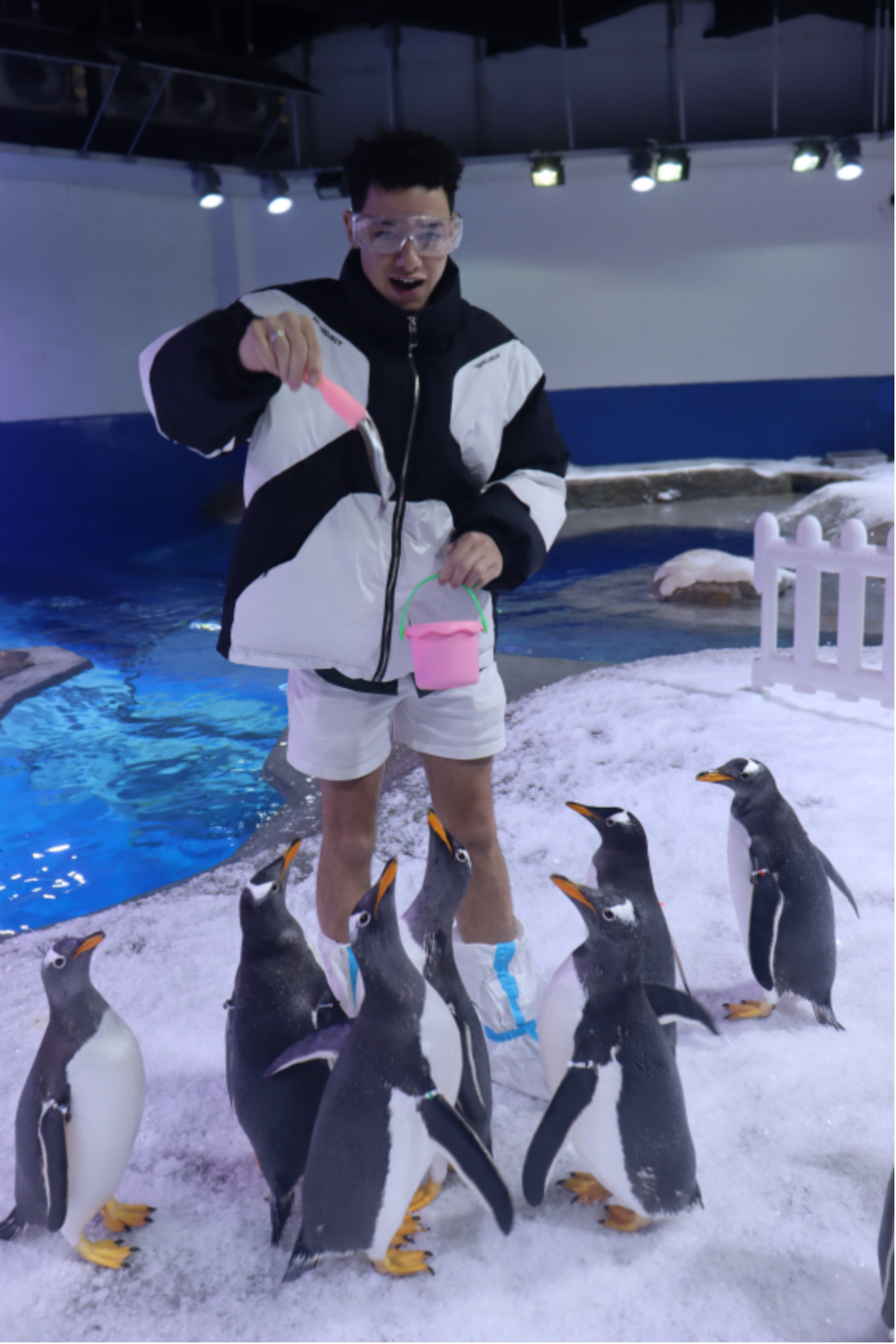 Harvey在海洋欢乐世界度假区与巴布雅企鹅互动