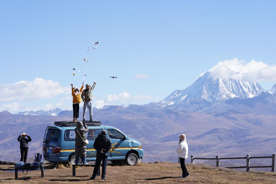 10月28日,游客在八郎生都观景平台拍照,后面是雅拉雪山。新华社记者 胥冰洁 摄