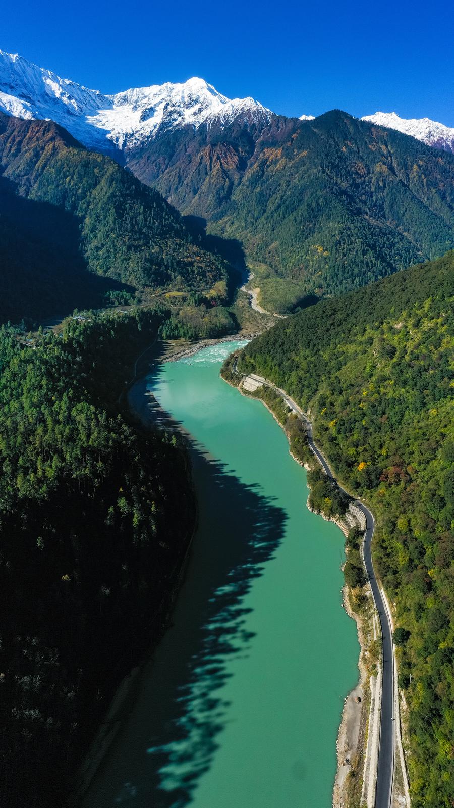 这是2024年11月8日拍摄的西藏自治区林芝市波密县至鲁朗镇的国道318公路(无人机照片)。新华社记者 沈伯韩 摄