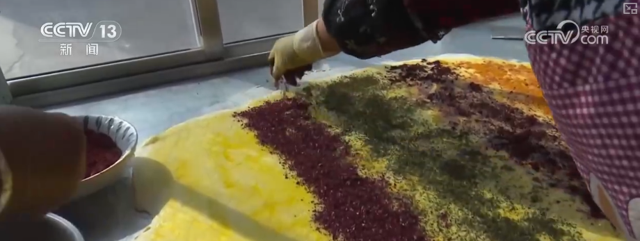 这种月饼又称千层饼,要将前一天发好的面团擀成一张张面皮,再将苦豆、姜黄、胡麻、红曲、玫瑰酱分别涂抹在每一张面皮上,层层叠压,最后再用一张大面皮将其包裹起来,点缀上蝴蝶形面饼,这月饼坯就做好了。
