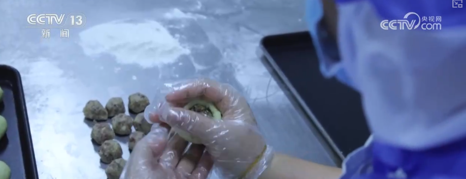 各种配料搅拌均匀后,工人们用面皮包裹馅料,揉成一个个面团,然后在模具的压制下做成月饼的面坯。经过30分钟的烘焙后,色泽金黄、香气扑鼻的香椿月饼就新鲜出炉了。