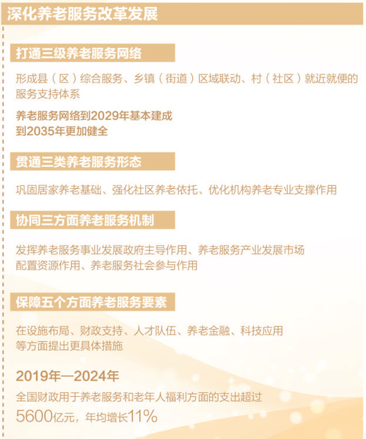 《意见》首次提出加快健全覆盖城乡的县乡村三级养老服务网络。在会上,民政部副部长唐承沛介绍了该举措的详细情况。按照《意见》部署,养老服务网络到2029年基本建成,到2035年更加健全。通过持续推进建设,把养老服务网织得更密更牢,稳稳兜住老年人的养老服务需求。