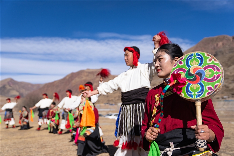 西藏昌都市丁青县尺犊镇乌巴村文艺演出队在跳热巴舞。 新华社记者 丁增尼达 摄