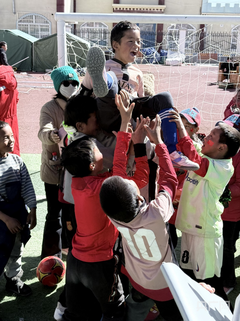 这是2025年1月26日,6.8级地震发生19天之后的西藏定日。这场球赛源自十几天前的约定。中国科学院心理研究所应急心理救援队在震后赶到灾区,领队吴坎坎告诉记者:“我们来的时候就问小朋友喜欢什么样的活动。第一个提到的都是说我们要踢球,我说我们满足你们,明天就给你们把球带来。”