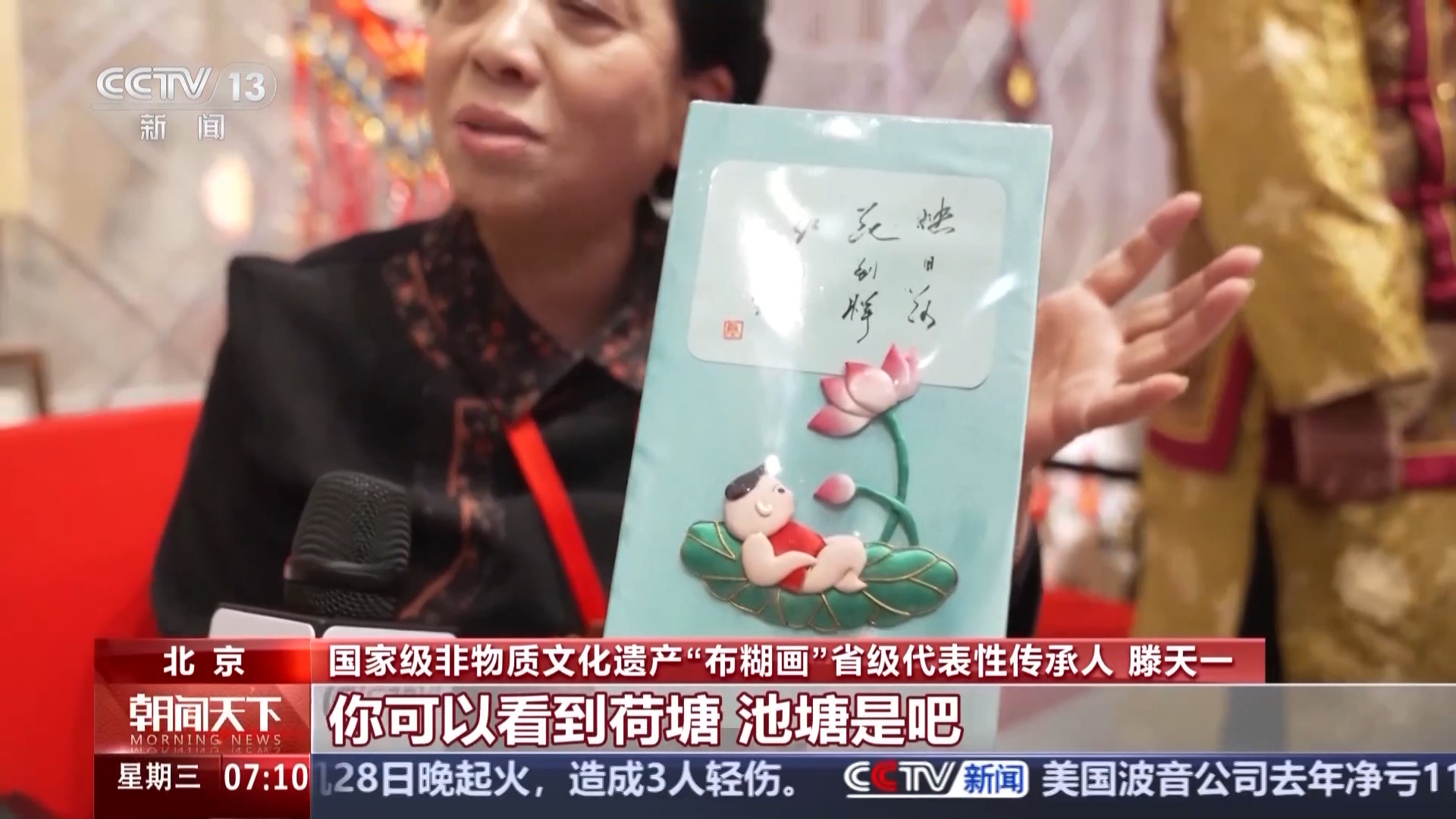 北京国家级非物质文化遗产“布糊画”省级代表性传承人 滕天一:很多手工挂件做完了到不了一分钟就买走了。从古到今几千年了,我们中国的东西到哪儿你细看,它是有内涵的东西。比如说我拿了杨万里的一句诗“映日荷花别样红”你可以看到荷塘、池塘是吧,再想到我们的诗、诗人,它都是有意境的。