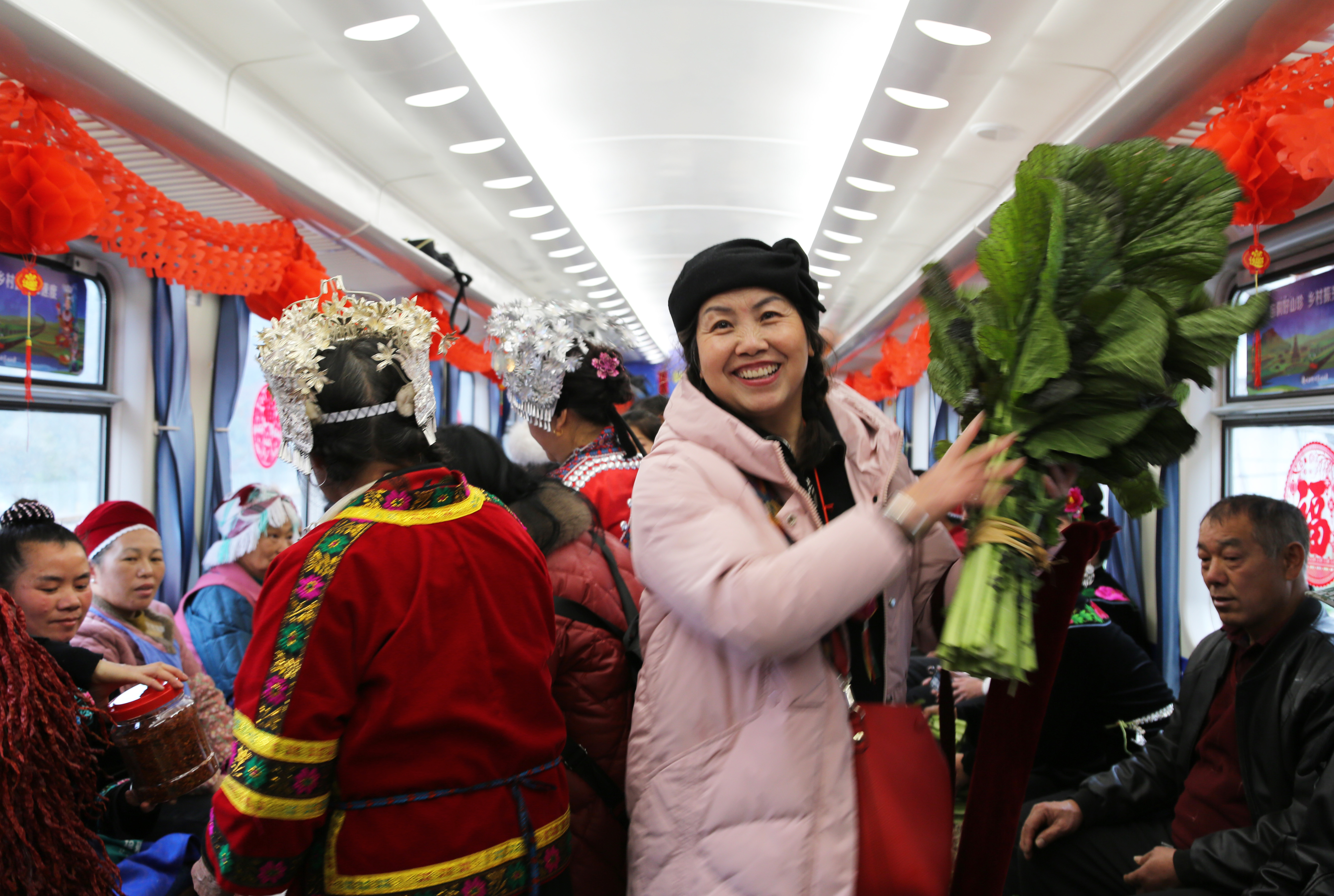 1月18日,在5640次列车上,乘客在“乡村集市”车厢购买蔬菜。新华社发(余天英 摄)