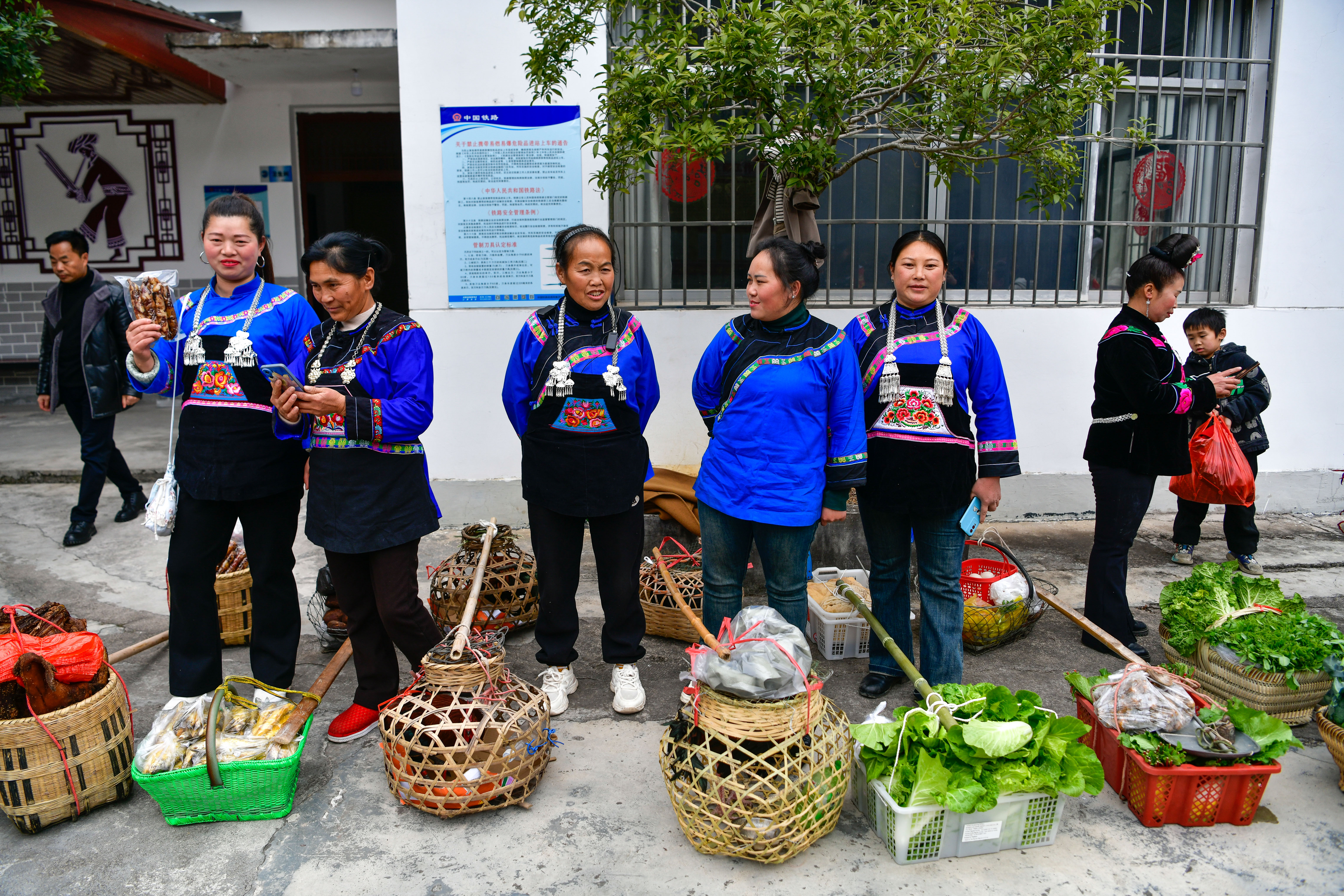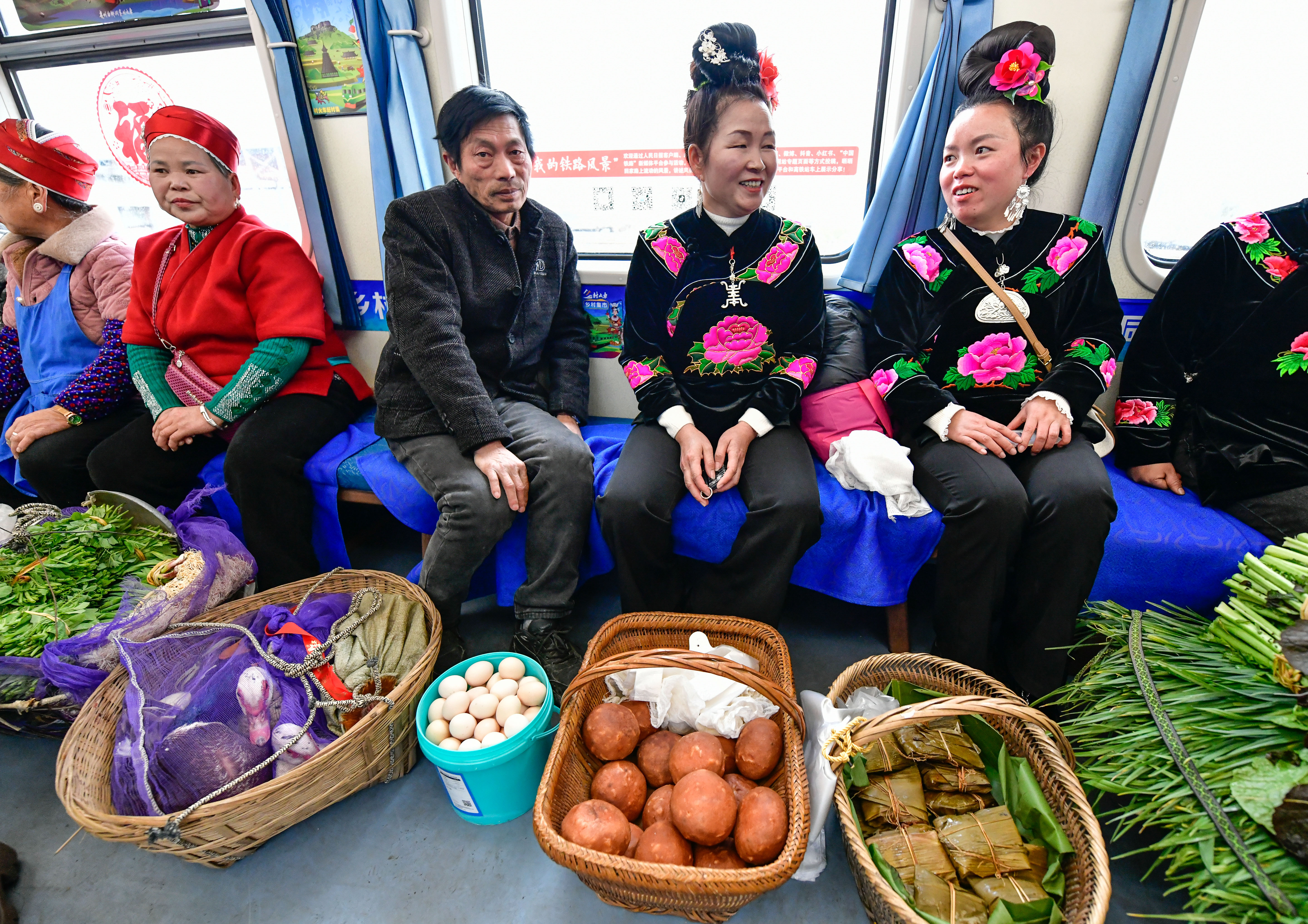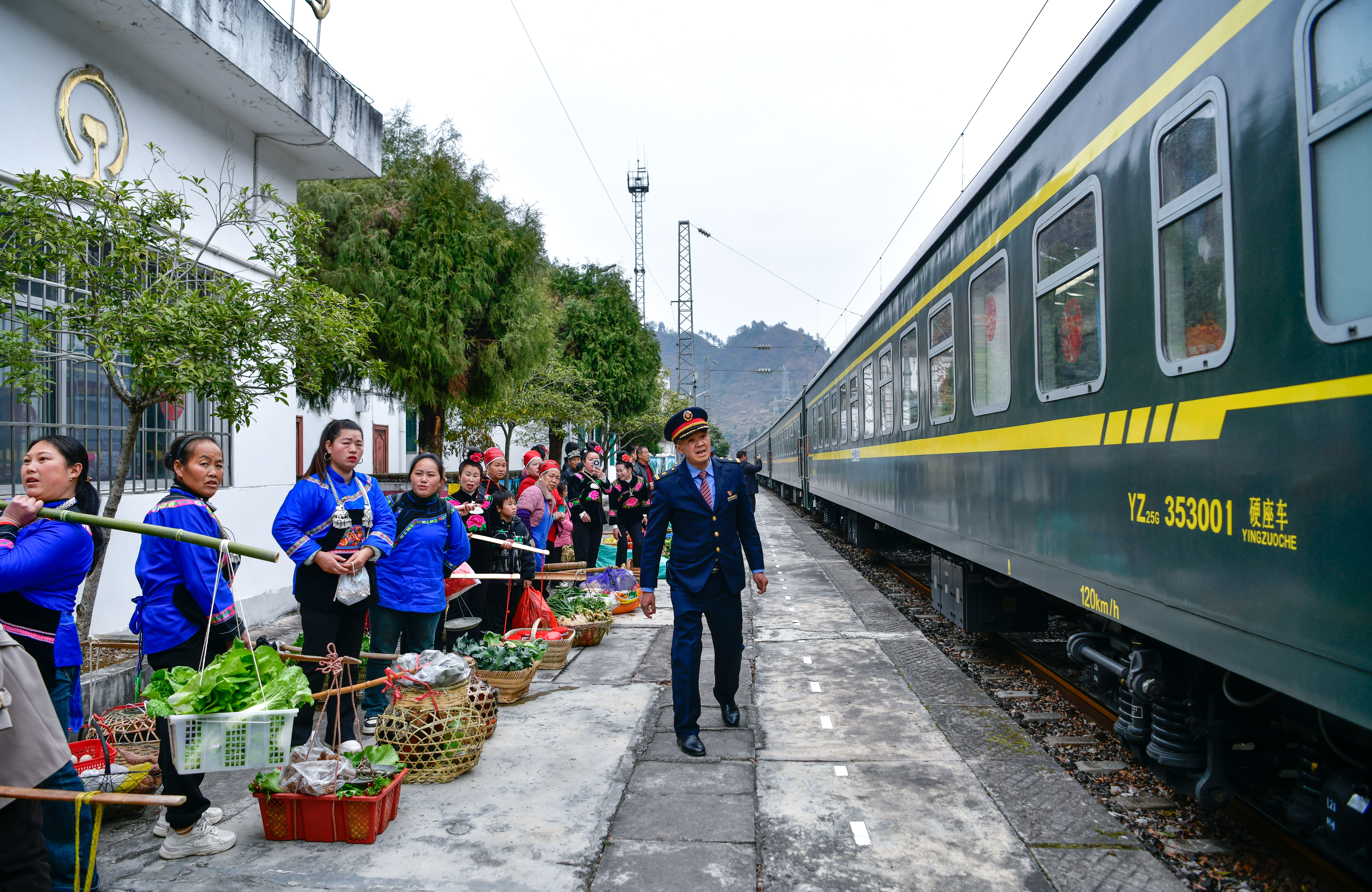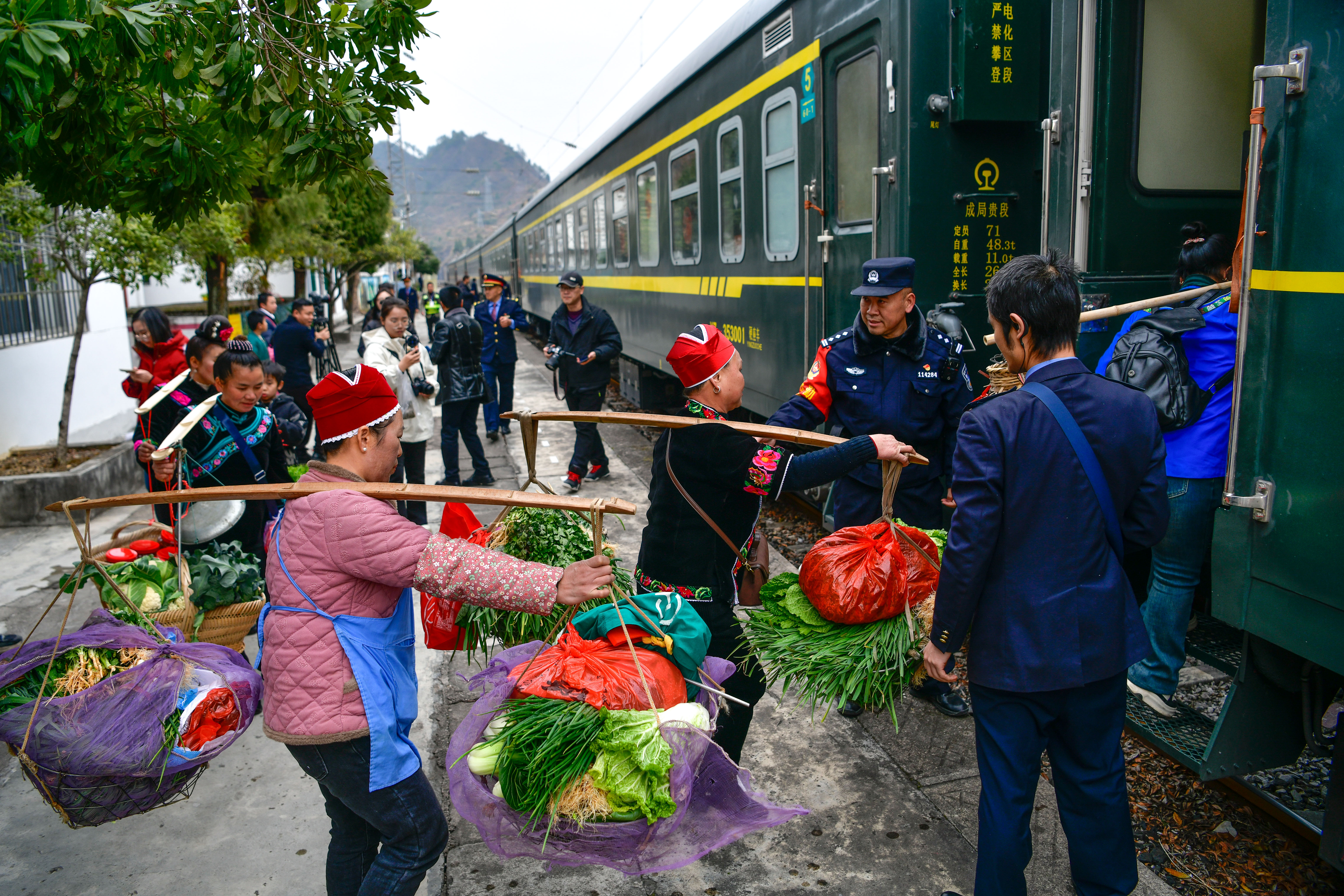 1月18日,在沪昆铁路六个鸡火车站,村民准备登上5640次列车售卖蔬菜和年货。新华社记者 杨文斌 摄