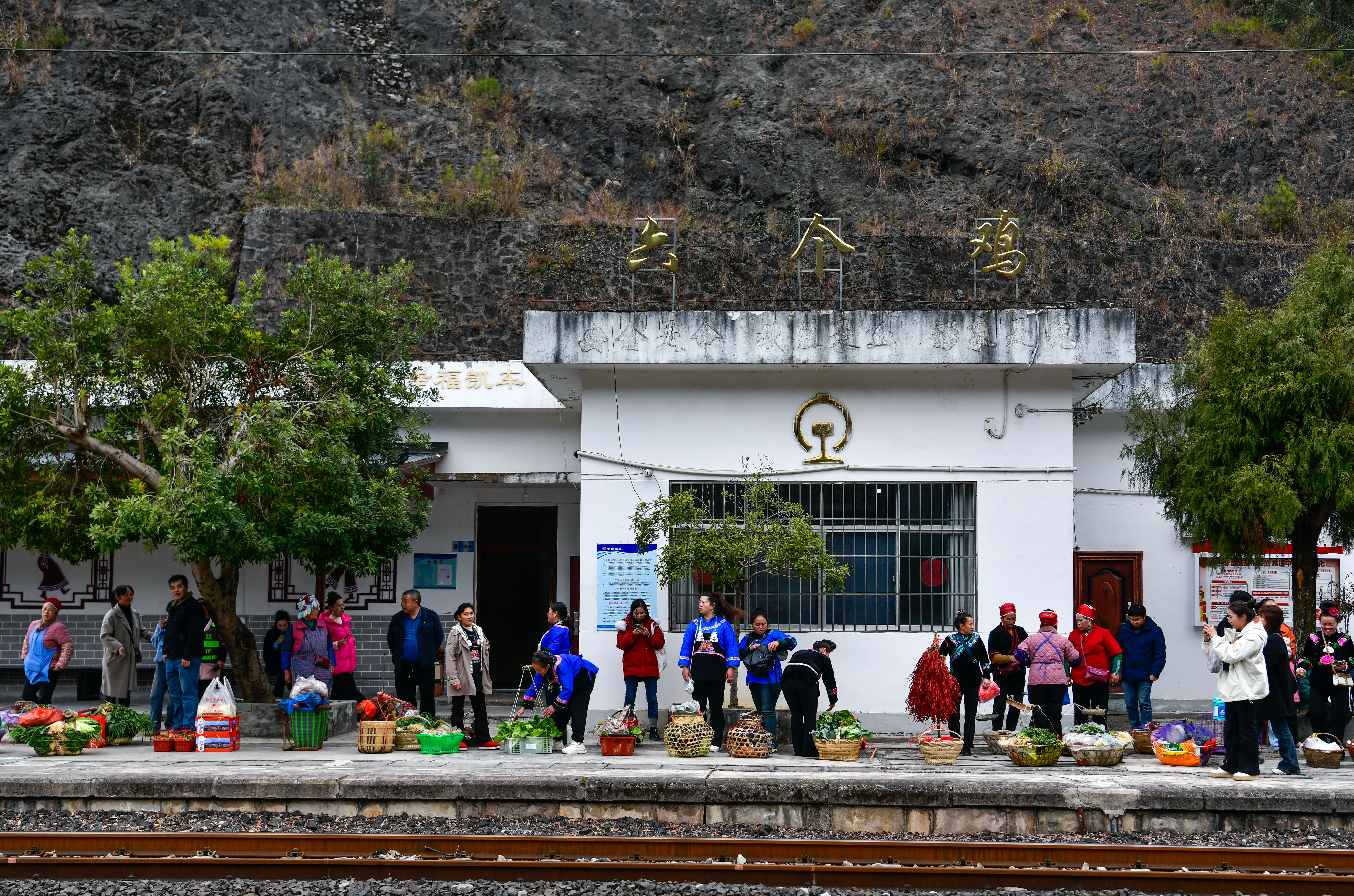 1月18日,在沪昆铁路六个鸡火车站,村民在站台等候5640次列车进站,准备将蔬菜和年货挑上车售卖。新华社记者 杨文斌 摄