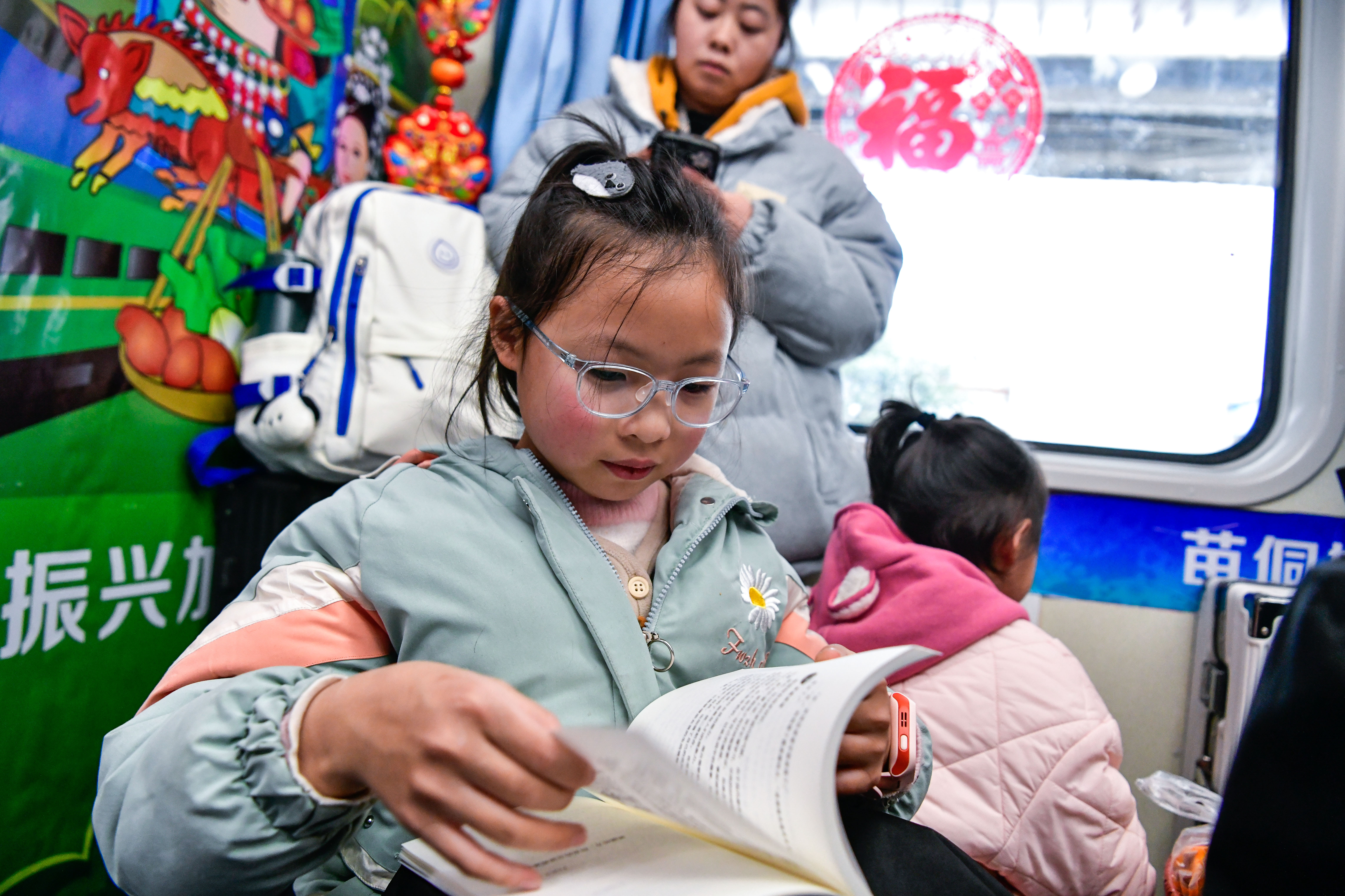 1月18日,一名小女孩在5640次列车上看书。新华社记者 杨文斌 摄